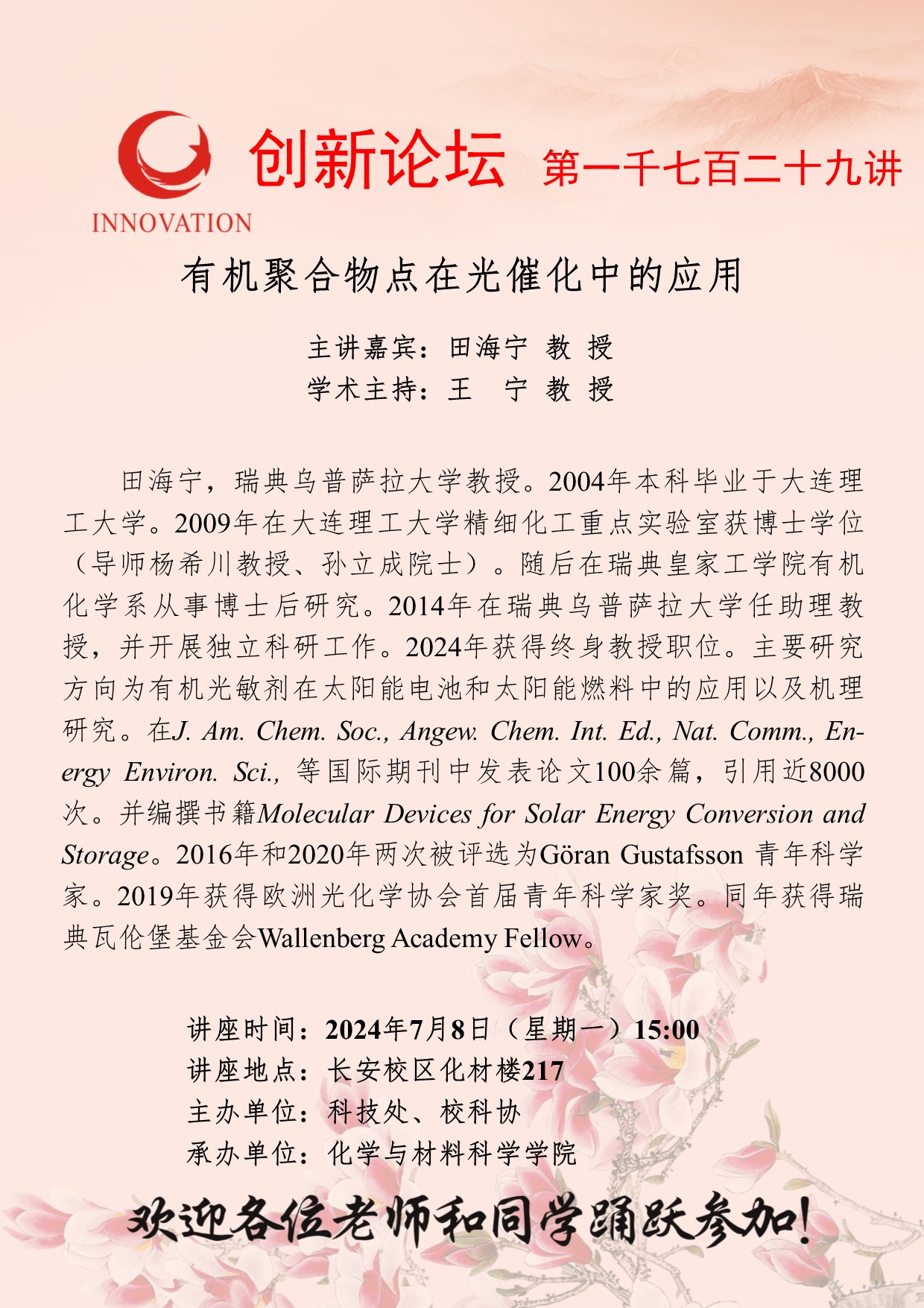 田海宁 教授 必赢3003no1线路检测中心创新论坛第一千七百二十九讲:有机聚合物点在光催化中的应用 讲座时间 2024年7月8日(星期一)15:00 讲座地点 长安校区化材楼217 讲座人介绍 田海宁 教授 讲座内容