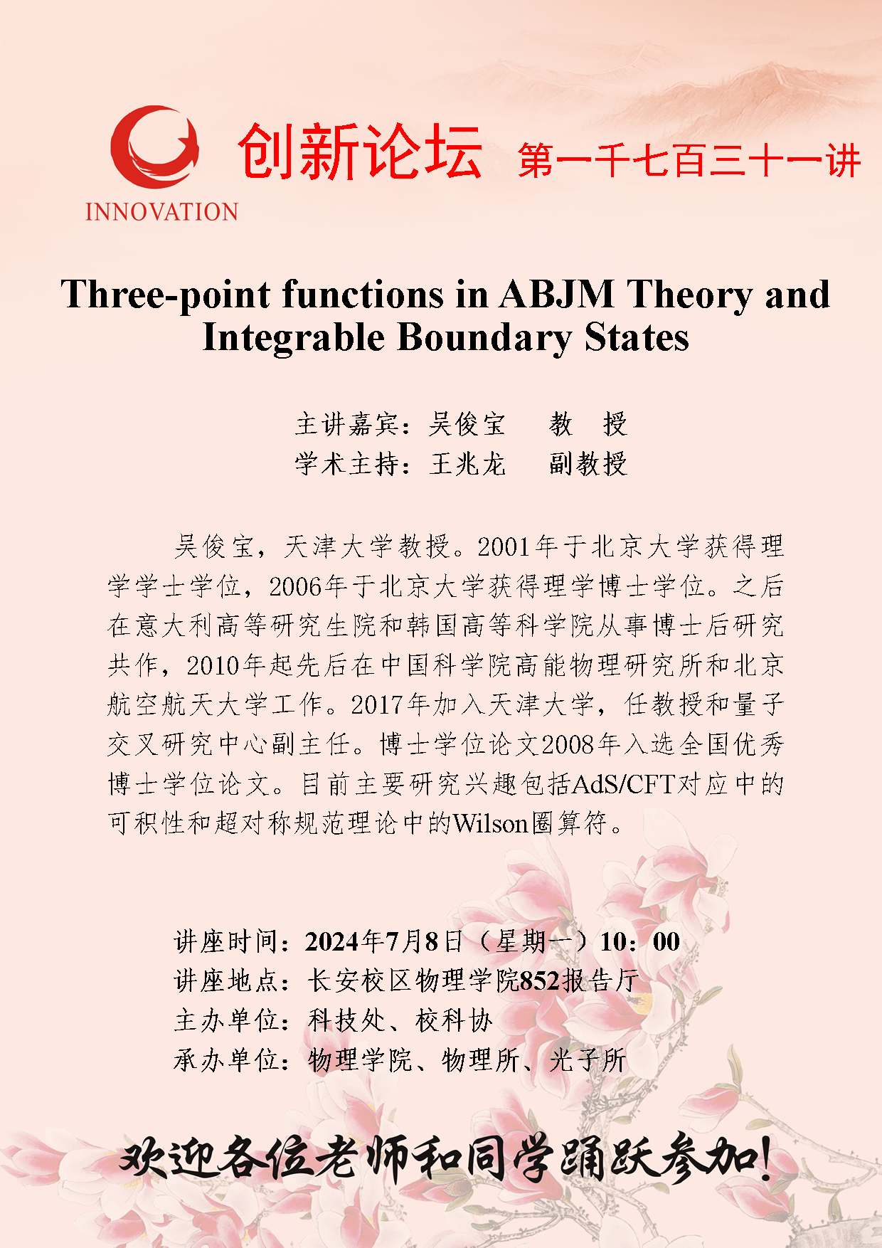 吴俊宝 教授 必赢3003no1线路检测中心创新论坛第一千七百三十一讲:Three-point functions in ABJM Theory and Integrable Boundary States 讲座时间 2024年7月8日(星期一)10:00 讲座地点 长安校区物理学院852报告厅 讲座人介绍 吴俊宝 教授 讲座内容