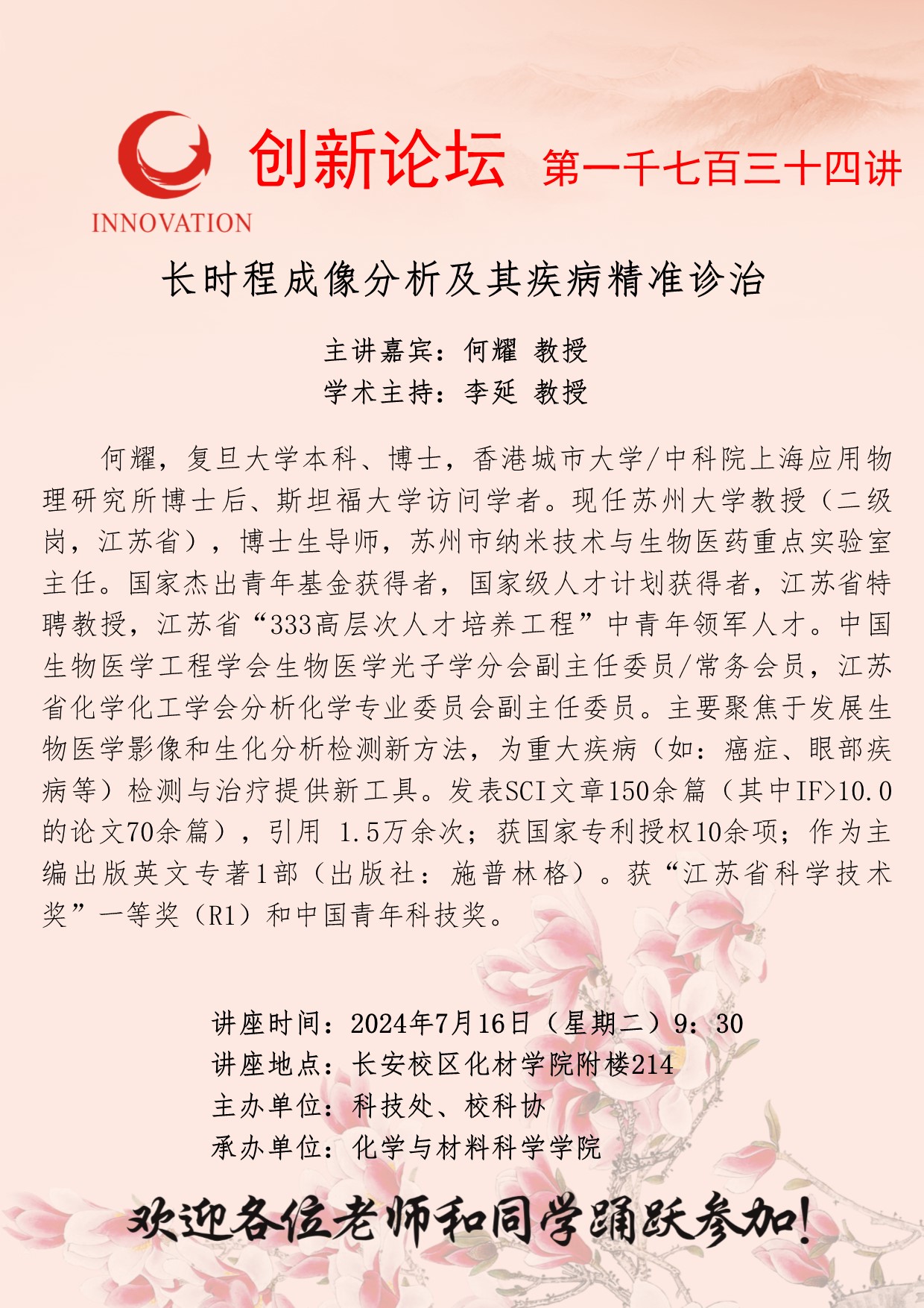 何耀 教授 必赢3003no1线路检测中心创新论坛第一千七百三十四讲:长时程成像分析及其疾病精准诊治 讲座时间 2024年7月16日(星期二)9:30 讲座地点 长安校区化材学院附楼214 讲座人介绍 何耀 教授 讲座内容