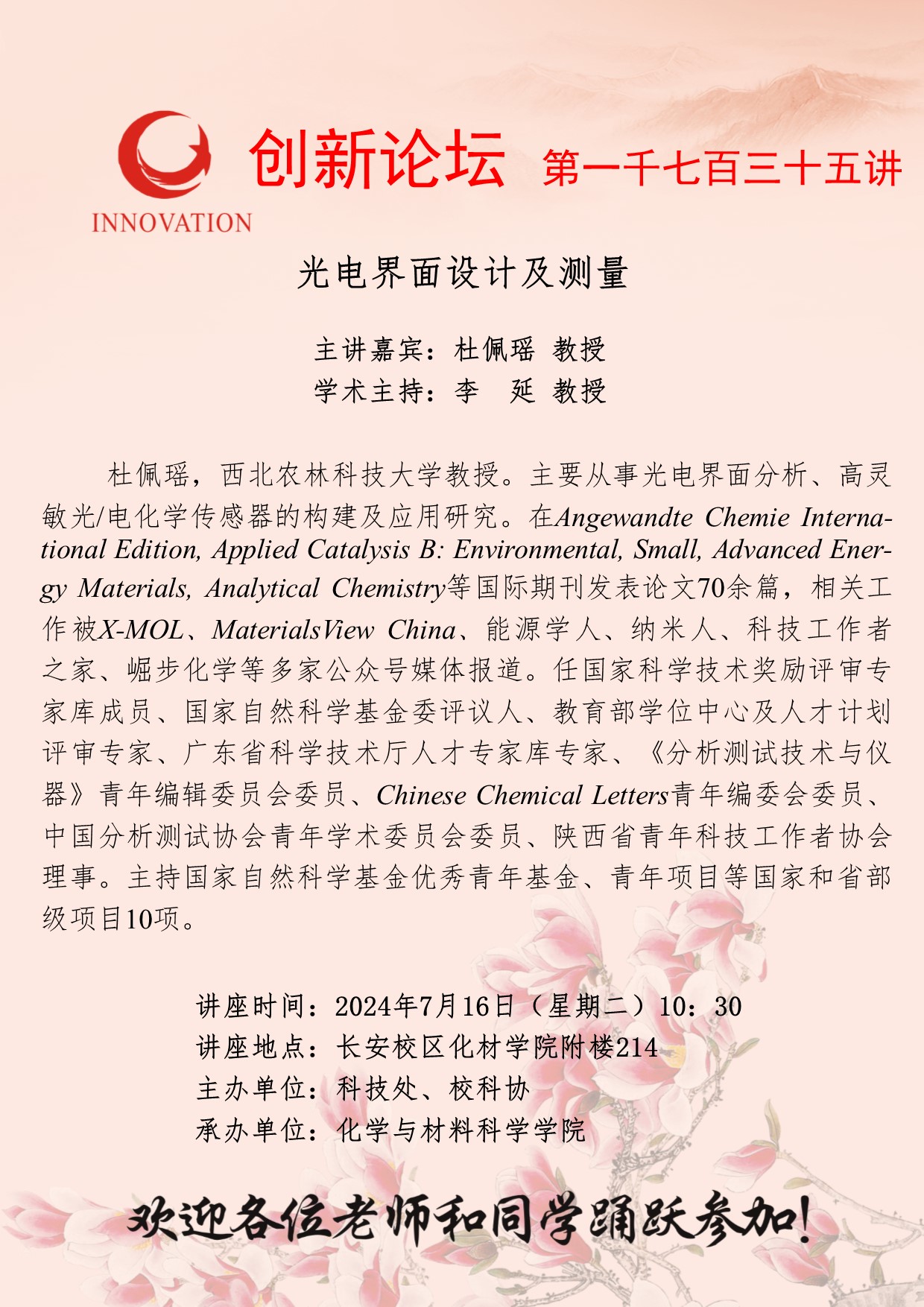 杜佩瑶 教授 必赢3003no1线路检测中心创新论坛第一千七百三十五讲:光电界面设计及测量 讲座时间 2024年7月16日(星期二)10:30 讲座地点 长安校区化材学院附楼214 讲座人介绍 杜佩瑶 教授 讲座内容