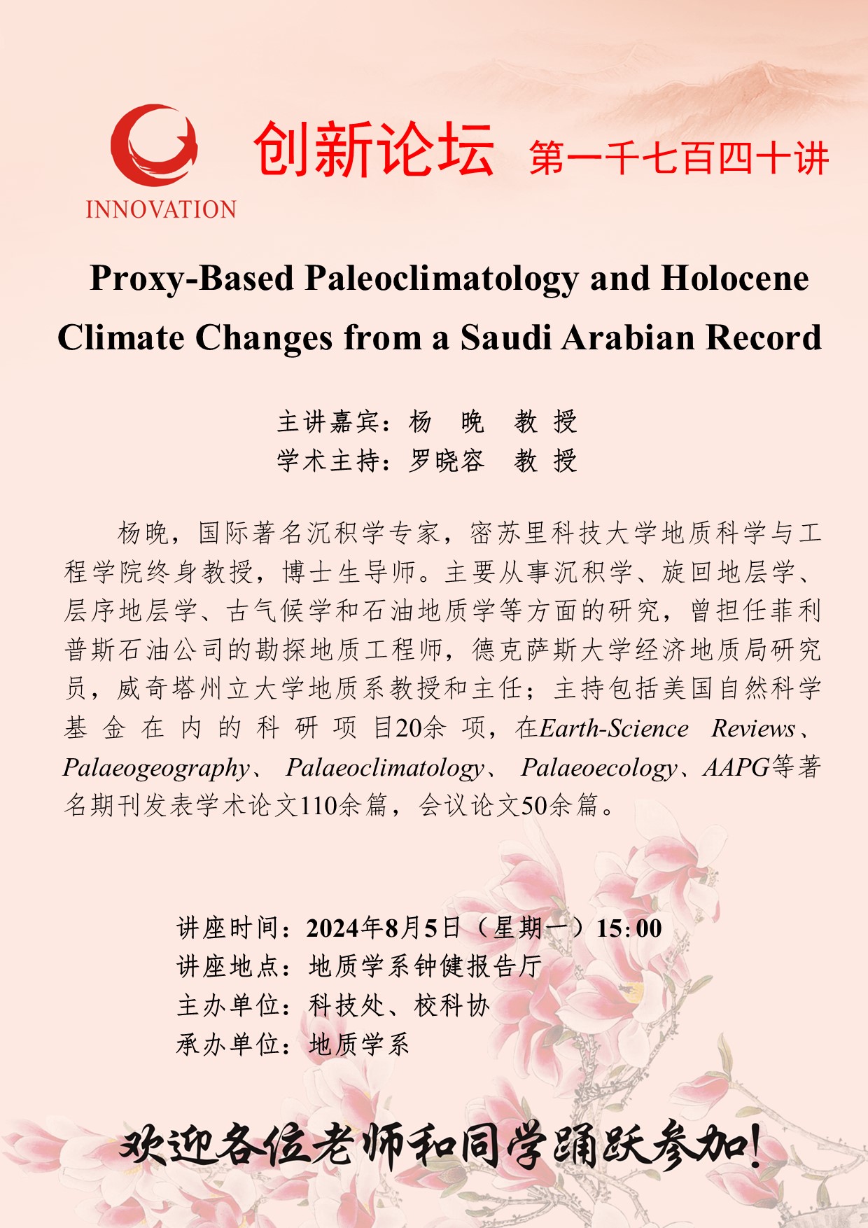 杨晚 教授 必赢3003no1线路检测中心创新论坛第一千七百四十讲: Proxy-Based Paleoclimatology and Holocene Climate Changes from a Saudi Arabian Record 讲座时间 2024年8月5日(星期一)15:00 讲座地点 地质学系钟健报告厅 讲座人介绍 杨晚 教授 讲座内容
