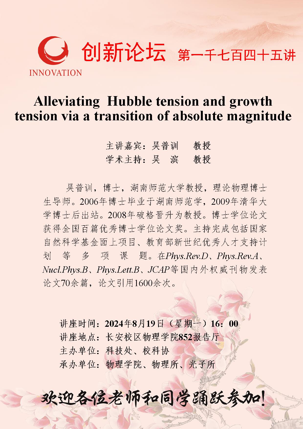 吴普训 教授 必赢3003no1线路检测中心创新论坛第一千七百四十五讲:Alleviating Hubble tension and growth tension via a transition of absolute magnitude 讲座时间 2024年8月19日(星期一)16:00 讲座地点 长安校区物理学院852报告厅 讲座人介绍 吴普训 教授 讲座内容