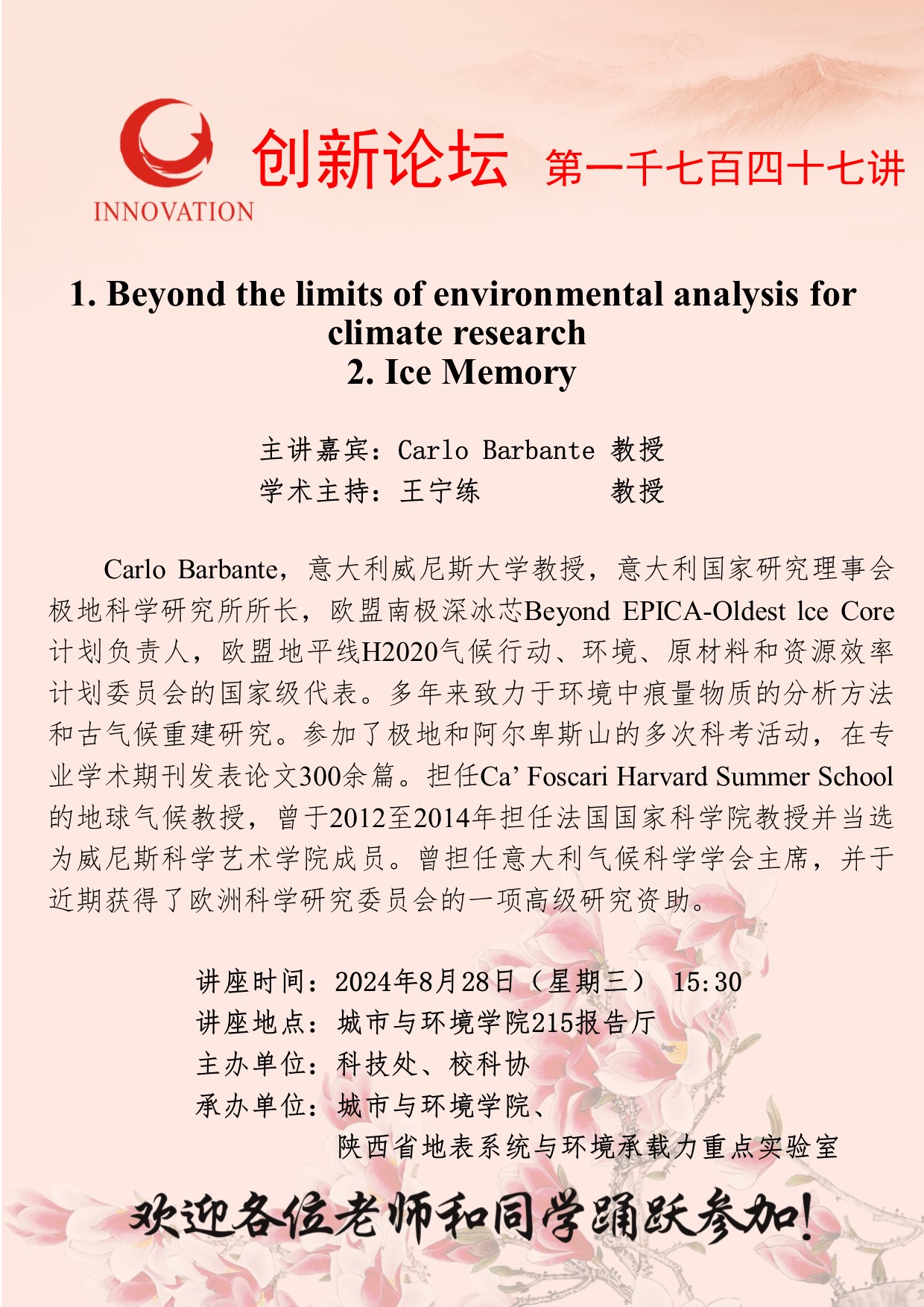 Carlo Barbante 教授 必赢3003no1线路检测中心创新论坛第一千七百四十七讲:1. Beyond the limits of environmental analysis for climate research 2. Ice Memory 讲座时间 2024年8月28日(星期三) 15:30 讲座地点 城市与环境学院215报告厅 讲座人介绍 Carlo Barbante 教授 讲座内容