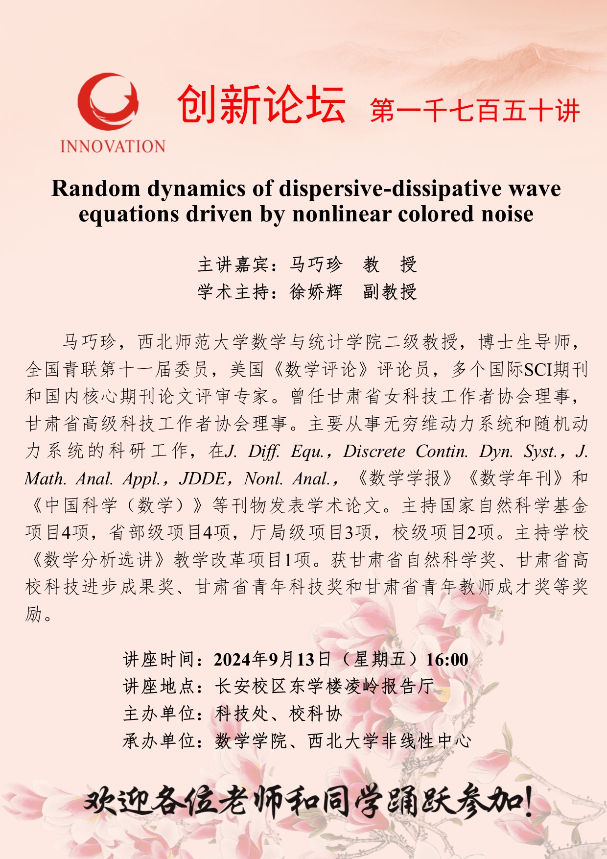 马巧珍 教授 必赢3003no1线路检测中心创新论坛第一千七百五十讲:Random dynamics of dispersive-dissipative wave equations driven by nonlinear colored noise 讲座时间 2024年9月13日(星期五)16:00 讲座地点 长安校区东学楼凌岭报告厅 讲座人介绍 马巧珍 教授 讲座内容