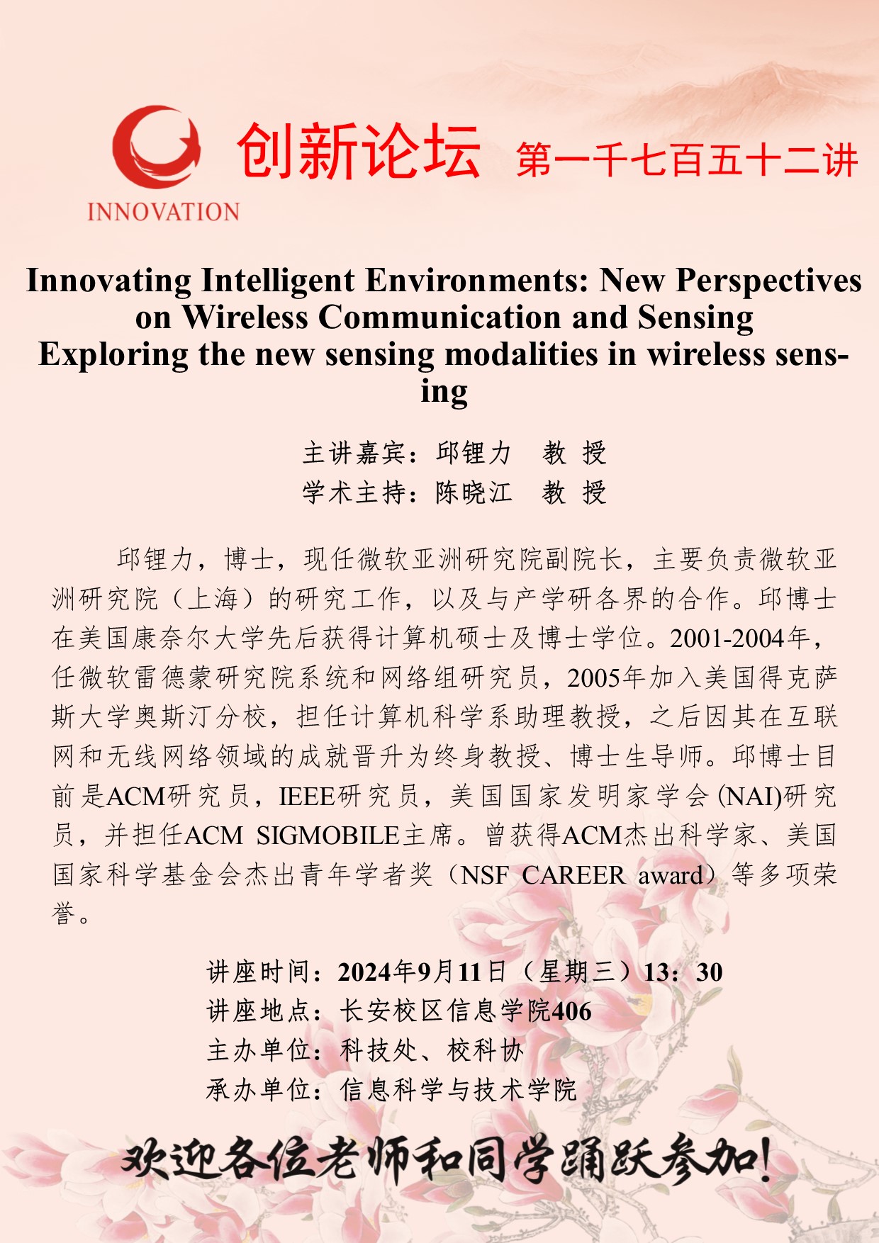 邱锂力 教授 必赢3003no1线路检测中心创新论坛第一千七百五十二讲:Innovating Intelligent Environments: New Perspectives on Wireless Communication and Sensing Exploring the new sensing modalities in wireless sensing 讲座时间 2024年9月11日(星期三)13:30 讲座地点 长安校区信息学院406 讲座人介绍 邱锂力 教授 讲座内容