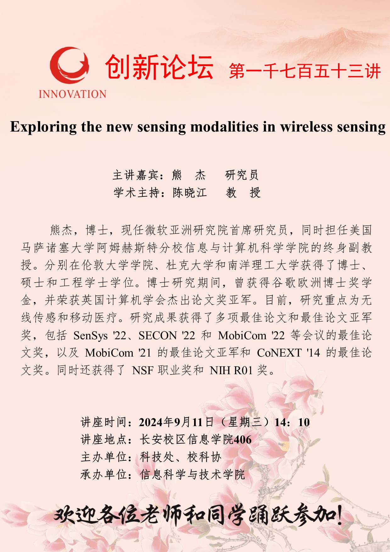 熊杰 研究员 必赢3003no1线路检测中心创新论坛第一千七百五十三讲:Exploring the new sensing modalities in wireless sensing 讲座时间 2024年9月11日(星期三)14:10 讲座地点 长安校区信息学院406 讲座人介绍 熊杰 研究员 讲座内容