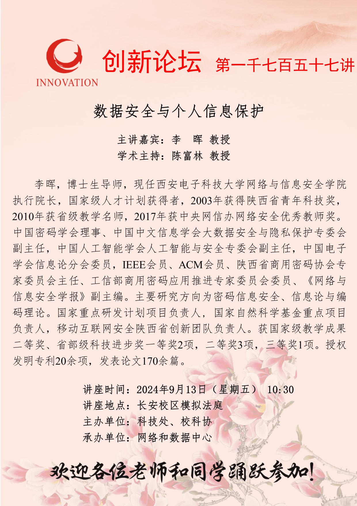 李晖 教授 必赢3003no1线路检测中心创新论坛第一千七百五十七讲:数据安全与个人信息保护 讲座时间 2024年9月13日(星期五) 10:30 讲座地点 长安校区模拟法庭 讲座人介绍 李晖 教授 讲座内容