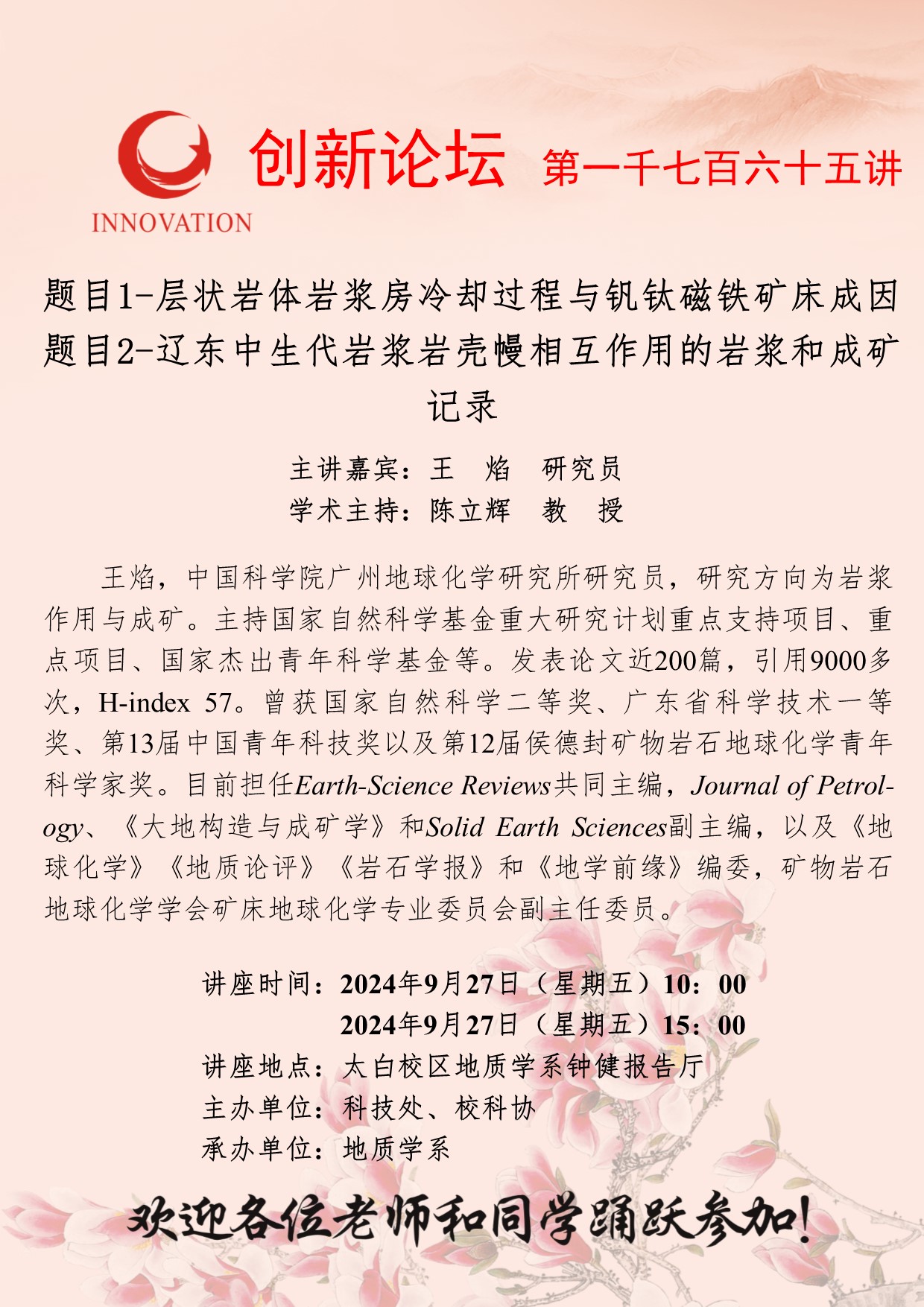 王焰 研究员 必赢3003no1线路检测中心创新论坛第一千七百六十五讲:题目1-层状岩体岩浆房冷却过程与钒钛磁铁矿床成因 题目2-辽东中生代岩浆岩壳幔相互作用的岩浆和成矿记录 讲座时间 2024年9月27日(星期五)10:00 2024年9月27日(星期五)15:00 讲座地点 太白校区地质学系钟健报告厅 讲座人介绍 王焰 研究员 讲座内容