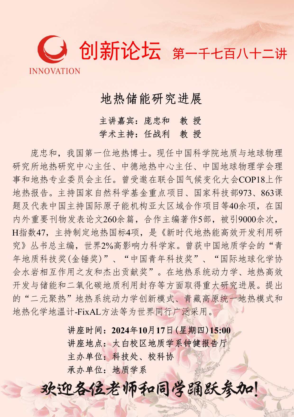 庞忠和 教授 必赢3003no1线路检测中心创新论坛第一千七百八十二讲:地热储能研究进展 讲座时间 2024年10月17日(星期四)15:00 讲座地点 太白校区地质学系钟健报告厅 讲座人介绍 庞忠和 教授 讲座内容