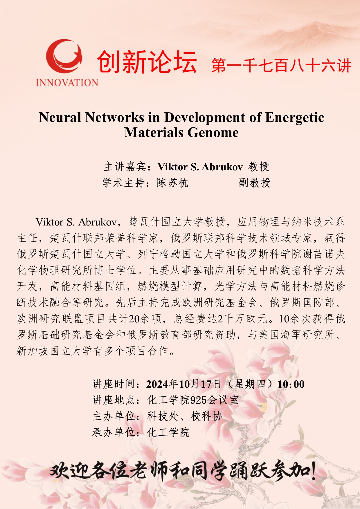 Viktor S. Abrukov 教授 必赢3003no1线路检测中心创新论坛第一千七百八十六讲:Neural Networks in Development of Energetic Materials Genome 讲座时间 2024年10月17日(星期四)10:00 讲座地点 化工学院925会议室 讲座人介绍 Viktor S. Abrukov 教授 讲座内容