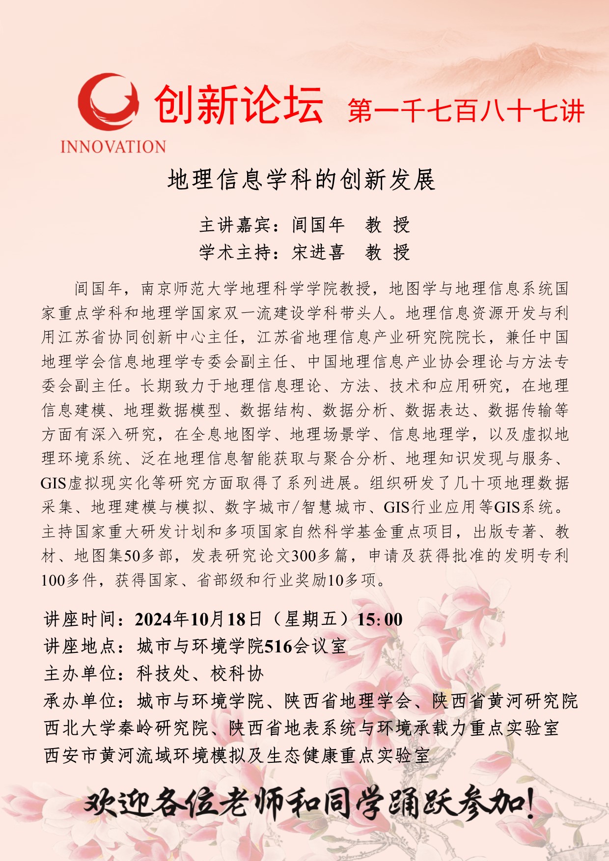 闾国年 教授 必赢3003no1线路检测中心创新论坛第一千七百八十七讲:地理信息学科的创新发展 讲座时间 2024年10月18日(星期五)15:00 讲座地点 城市与环境学院516会议室 讲座人介绍 闾国年 教授 讲座内容