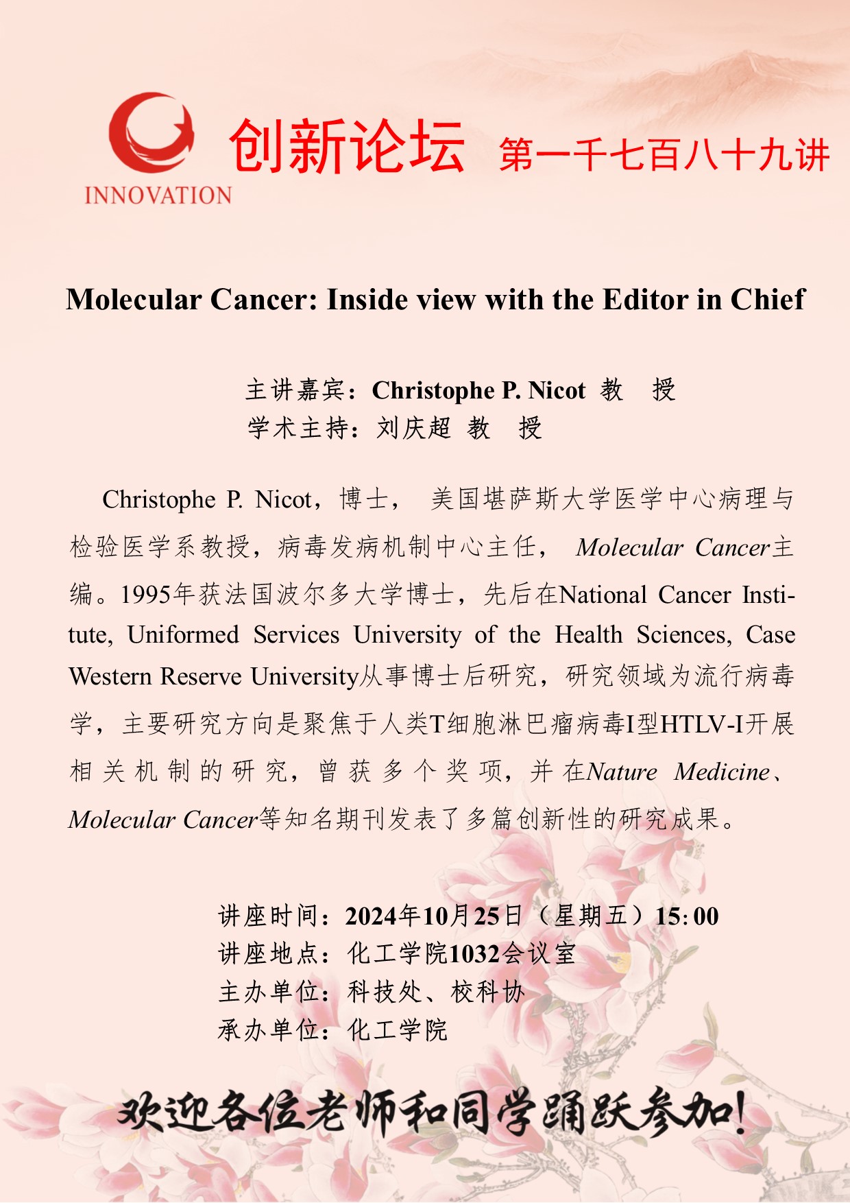 Christophe P. Nicot 教授 必赢3003no1线路检测中心创新论坛第一千七百八十九讲:Molecular Cancer: Inside view with the Editor in Chief 讲座时间 2024年10月25日(星期五)15:00 讲座地点 化工学院1032会议室 讲座人介绍 Christophe P. Nicot 教授 讲座内容