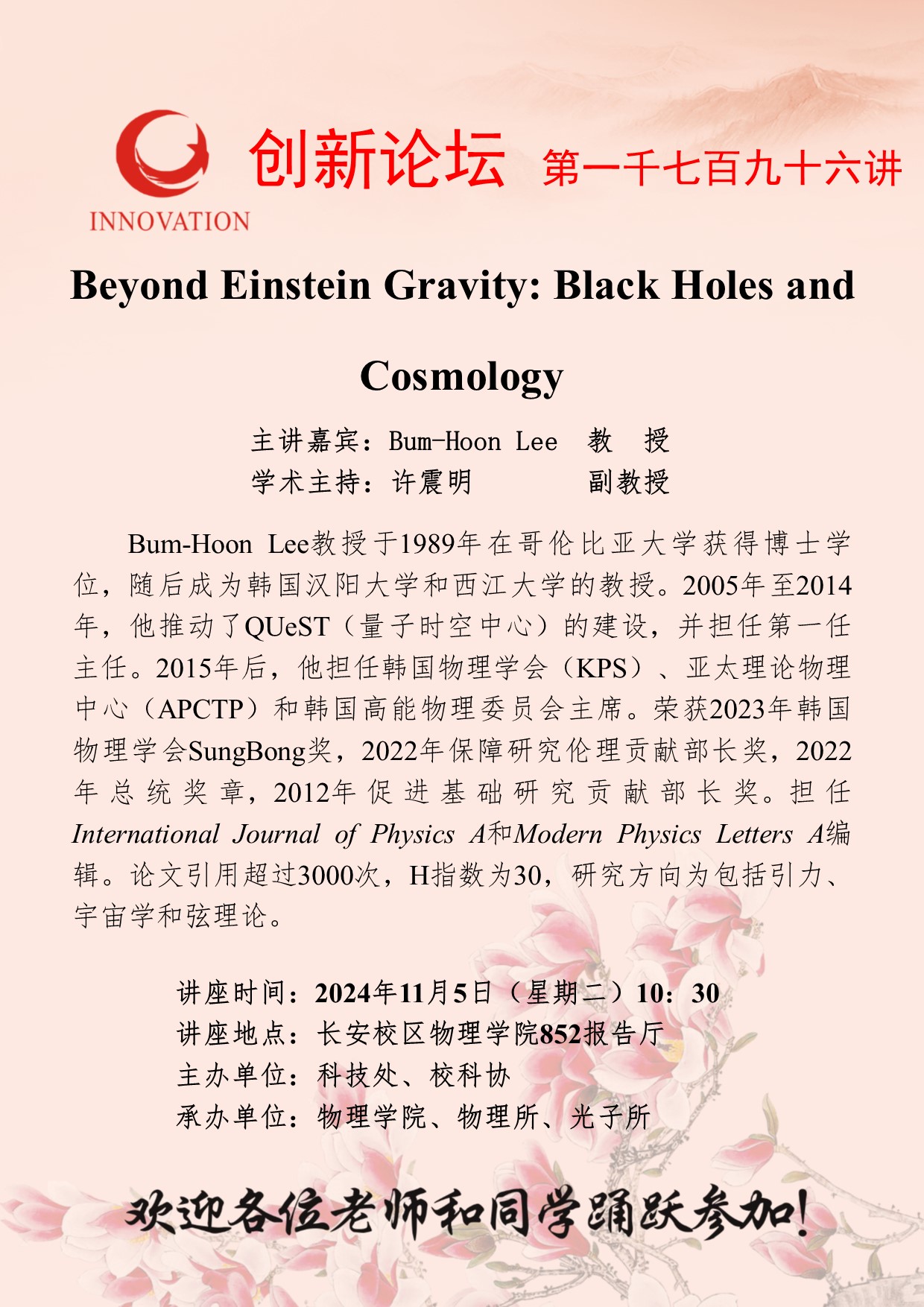 Bum-Hoon Lee 教授 必赢3003no1线路检测中心创新论坛第一千七百九十六讲:Beyond Einstein Gravity: Black Holes and Cosmology 讲座时间 2024年11月5日(星期二)10:30 讲座地点 长安校区物理学院852报告厅 讲座人介绍 Bum-Hoon Lee 教授 讲座内容
