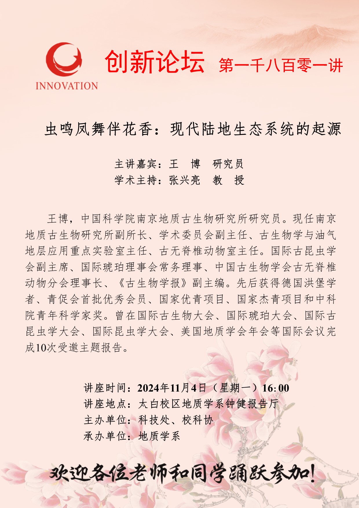 王 博 研究员 必赢3003no1线路检测中心创新论坛第一千八百零一讲:虫鸣凤舞伴花香:现代陆地生态系统的起源 讲座时间 2024年11月4日(星期一)16:00 讲座地点 太白校区地质学系钟健报告厅 讲座人介绍 王 博 研究员 讲座内容
