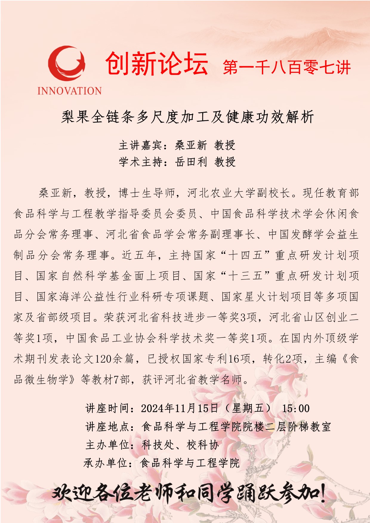 桑亚新 教授 必赢3003no1线路检测中心创新论坛第一千八百零七讲: 梨果全链条多尺度加工及健康功效解析 讲座时间 2024年11月15日(星期五) 15:00 讲座地点 食品科学与工程学院院楼二层阶梯教室 讲座人介绍 桑亚新 教授 讲座内容