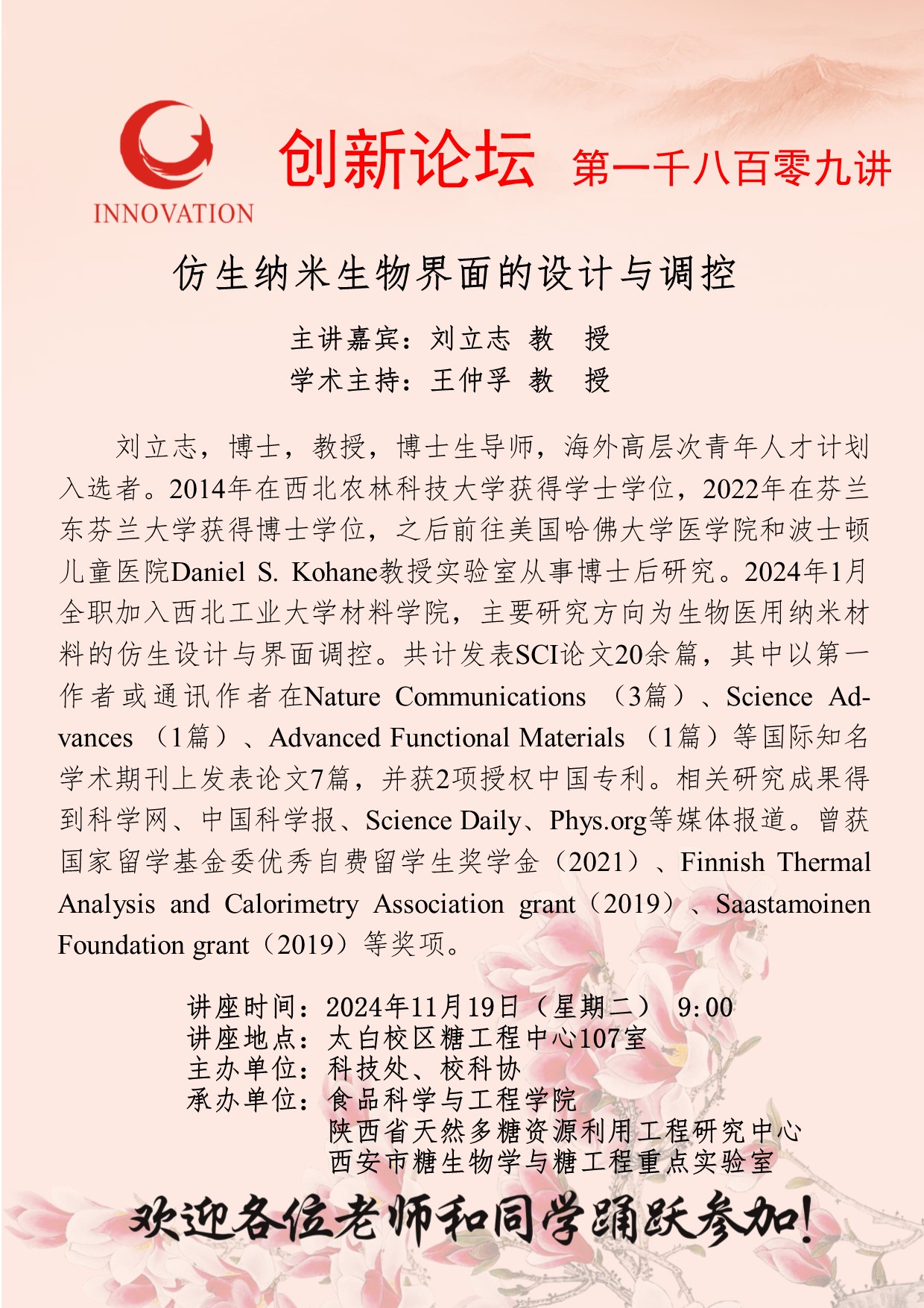 刘立志 教授 必赢3003no1线路检测中心创新论坛第一千八百零九讲:仿生纳米生物界面的设计与调控 讲座时间 2024年11月19日(星期二) 9:00 讲座地点 太白校区糖工程中心107室 讲座人介绍 刘立志 教授 讲座内容
