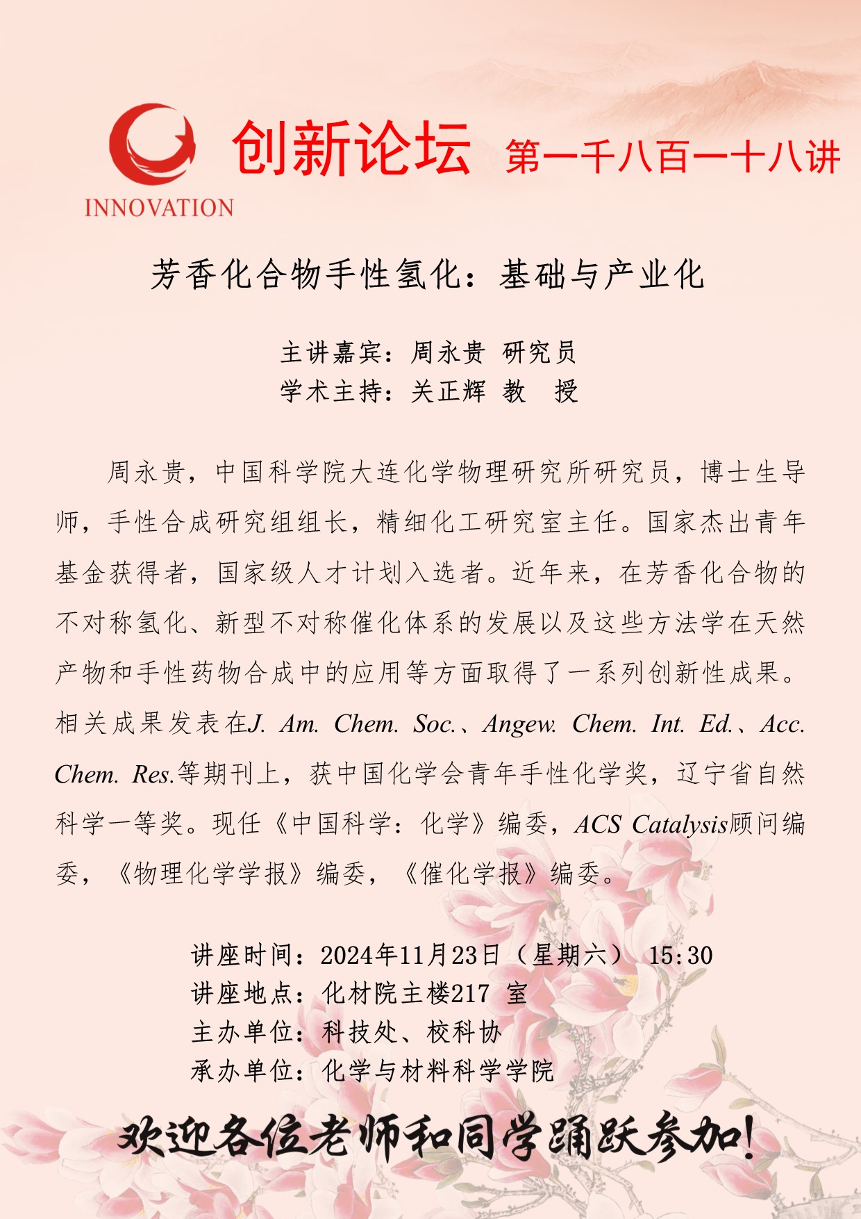 周永贵 研究员 必赢3003no1线路检测中心创新论坛第一千八百一十八讲:芳香化合物手性氢化:基础与产业化 讲座时间 2024年11月23日(星期六) 15:30 讲座地点 化材院主楼217 室 讲座人介绍 周永贵 研究员 讲座内容