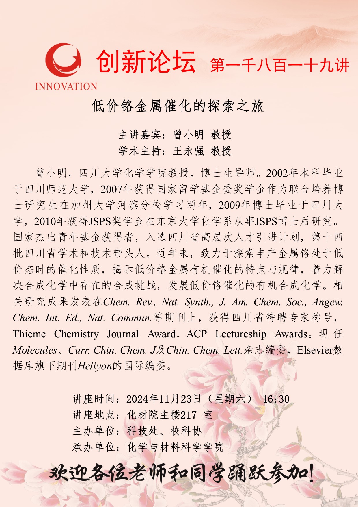 曾小明 教授 必赢3003no1线路检测中心创新论坛第一千八百一十九讲:低价铬金属催化的探索之旅 讲座时间 2024年11月23日(星期六) 16:30 讲座地点 化材院主楼217 室 讲座人介绍 曾小明 教授 讲座内容