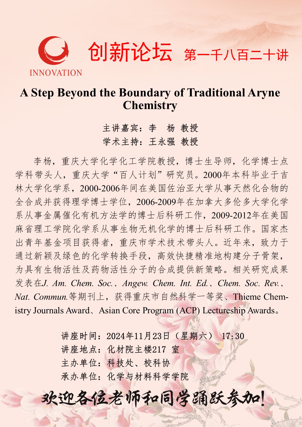 李杨 教授 必赢3003no1线路检测中心创新论坛第一千八百二十讲:A Step Beyond the Boundary of Traditional Aryne Chemistry 讲座时间 2024年11月23日(星期六) 17:30 讲座地点 化材院主楼217室 讲座人介绍 李杨 教授 讲座内容