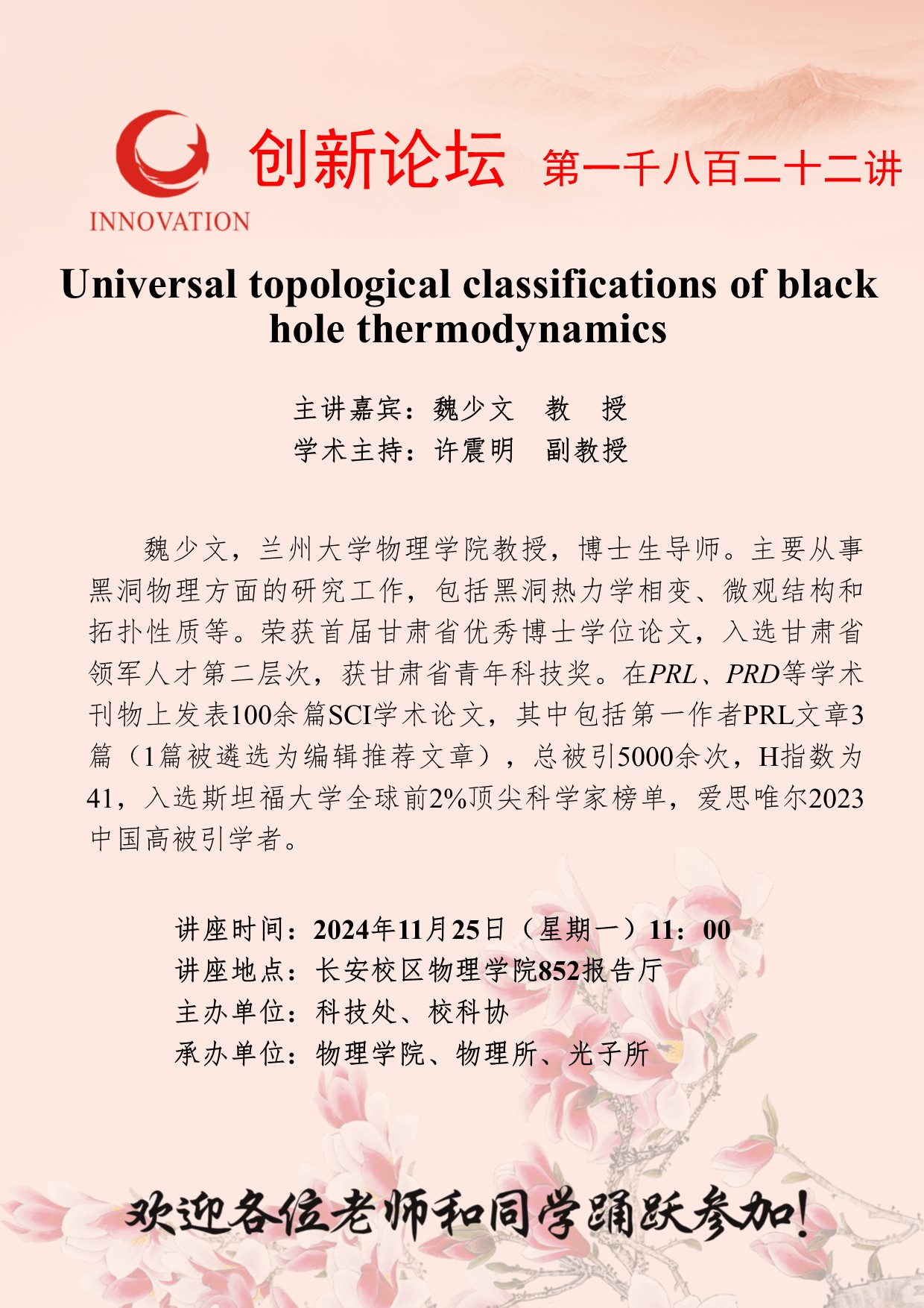 魏少文 教授 必赢3003no1线路检测中心创新论坛第一千八百二十二讲:Universal topological classifications of black hole thermodynamics 讲座时间 2024年11月25日(星期一)11:00 讲座地点 长安校区物理学院852报告厅 讲座人介绍 魏少文 教授 讲座内容