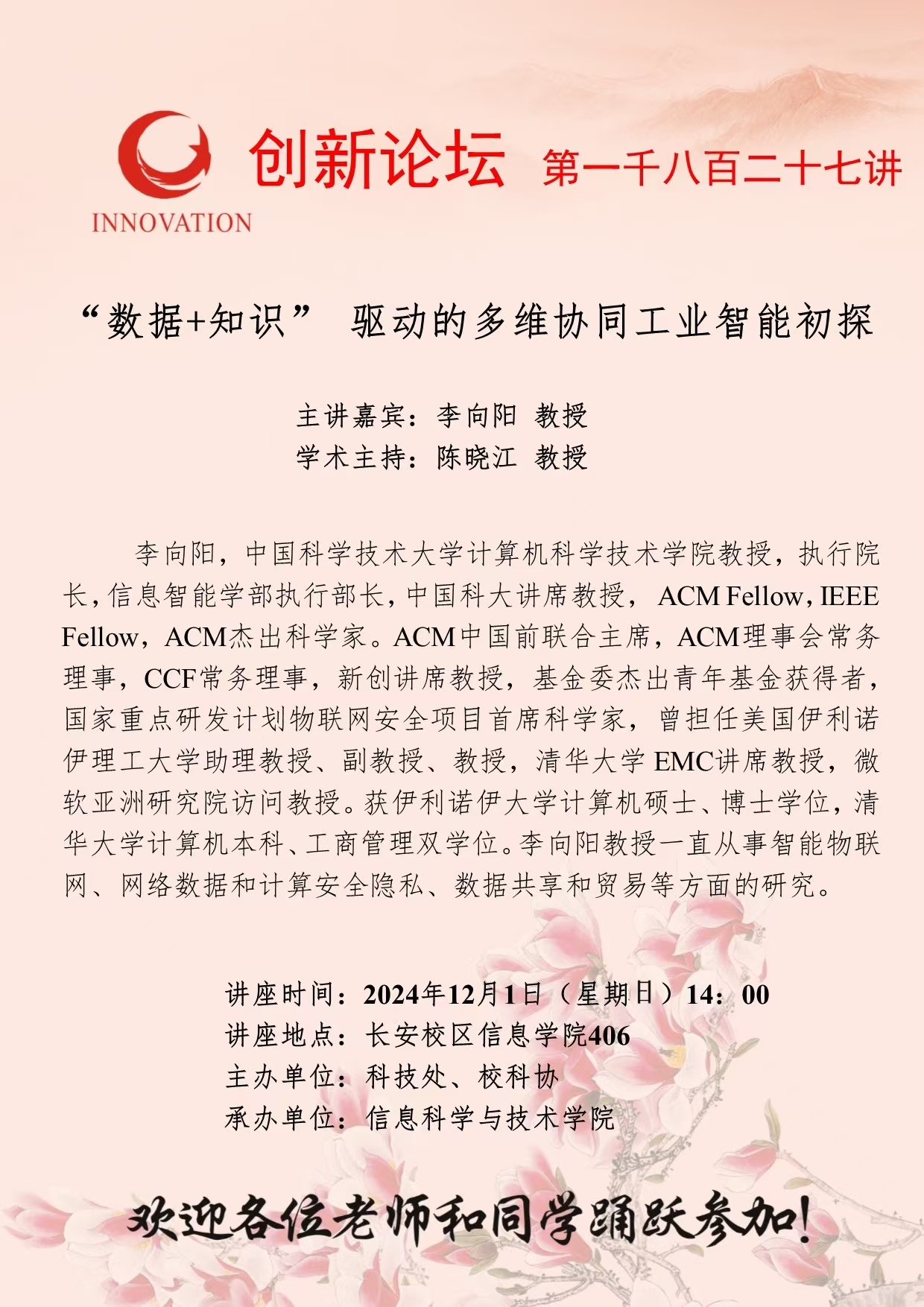李向阳 教授 必赢3003no1线路检测中心创新论坛第一千八百二十七讲:“数据+知识” 驱动的多维协同工业智能初探 讲座时间 2024年12月1日(星期日)14:00 讲座地点 长安校区信息学院406 讲座人介绍 李向阳 教授 讲座内容