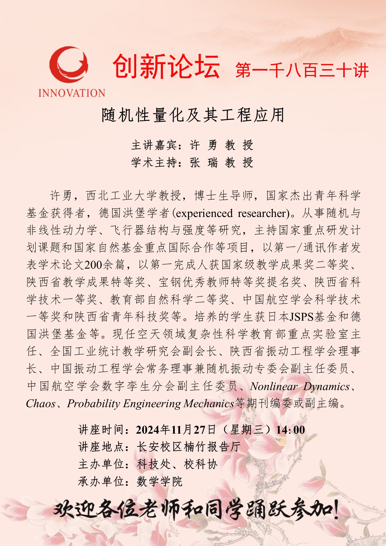 许勇 教授 必赢3003no1线路检测中心创新论坛第一千八百三十讲:随机性量化及其工程应用 讲座时间 2024年11月27日(星期三)14:00 讲座地点 长安校区楠竹报告厅 讲座人介绍 许勇 教授 讲座内容