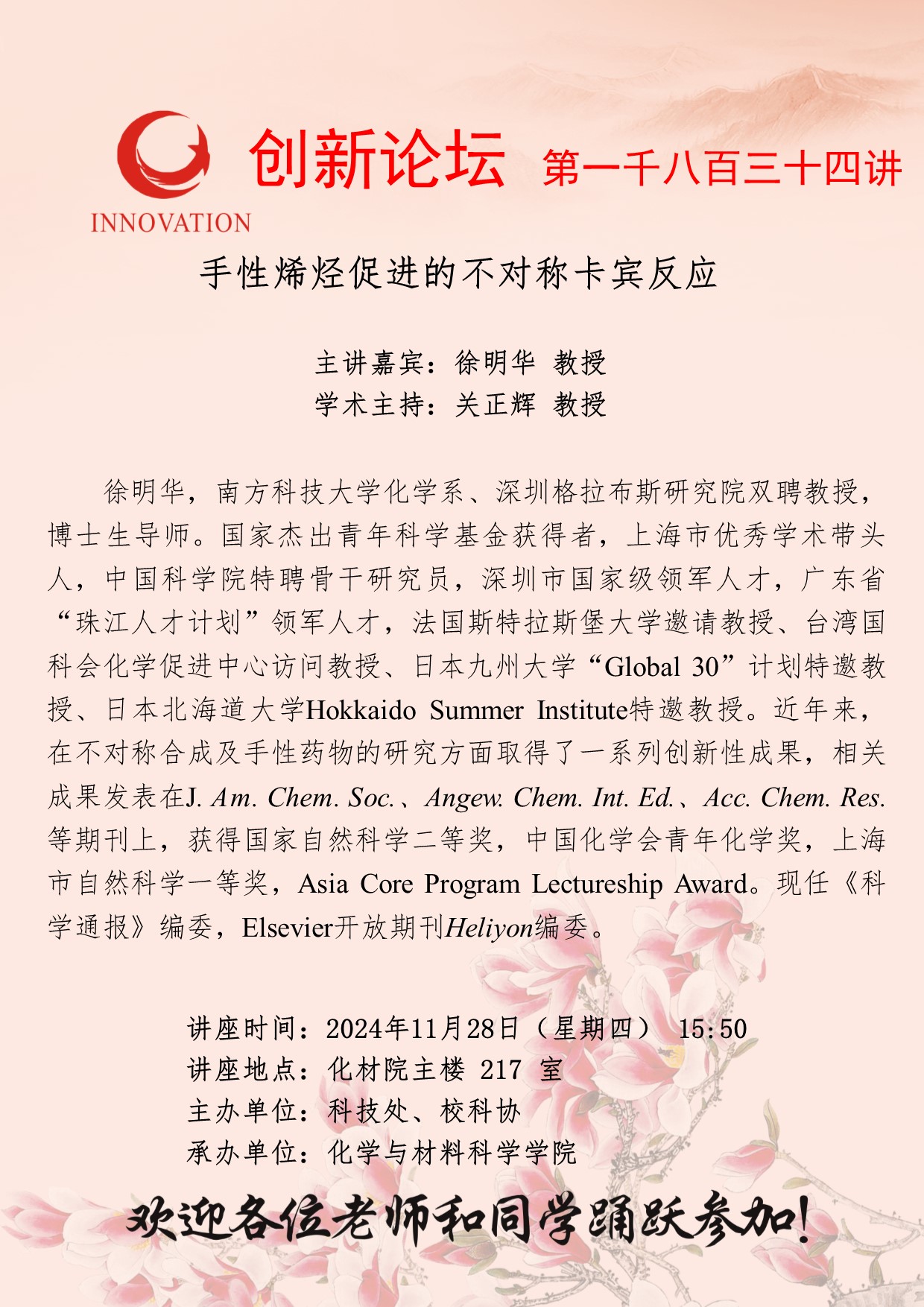 徐明华 教授 必赢3003no1线路检测中心创新论坛第一千八百三十四讲:手性烯烃促进的不对称卡宾反应 讲座时间 2024年11月28日(星期四) 15:50 讲座地点 化材院主楼217室 讲座人介绍 徐明华 教授 讲座内容