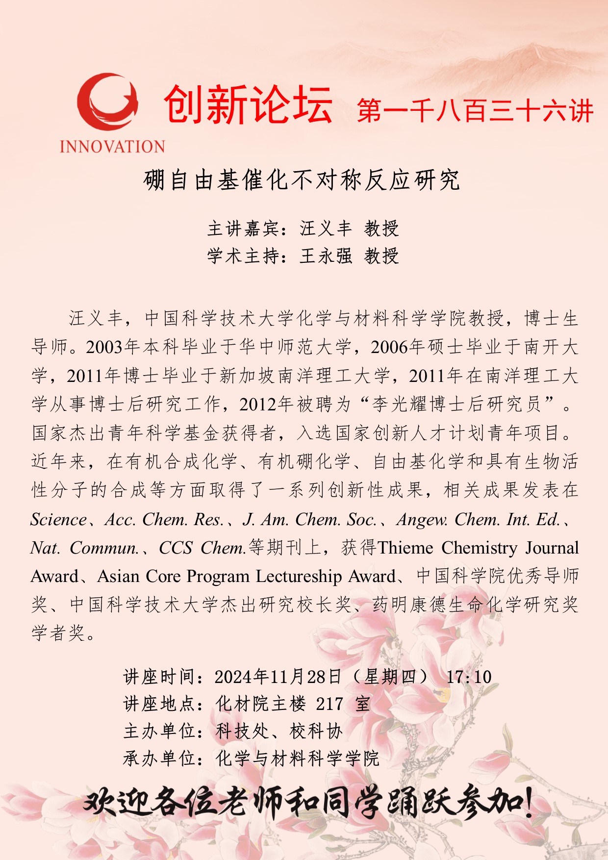汪义丰 教授 必赢3003no1线路检测中心创新论坛第一千八百三十六讲:硼自由基催化不对称反应研究 讲座时间 2024年11月28日(星期四) 17:10 讲座地点 化材院主楼217室 讲座人介绍 汪义丰 教授 讲座内容