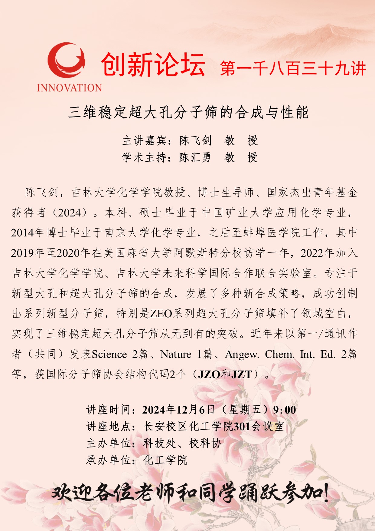 陈飞剑 教授 必赢3003no1线路检测中心创新论坛第一千八百三十九讲:三维稳定超大孔分子筛的合成与性能 讲座时间 2024年12月6日(星期五)9:00 讲座地点 长安校区化工学院301会议室 讲座人介绍 陈飞剑 教授 讲座内容 嗯
