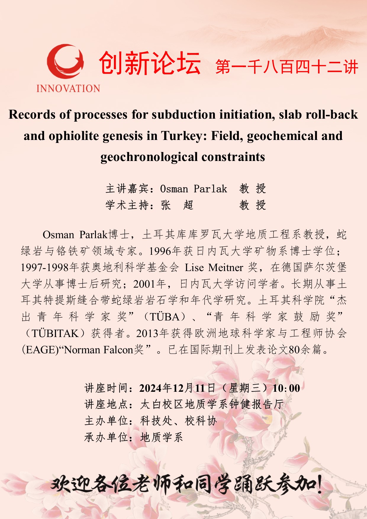 Osman Parlak 教授 必赢3003no1线路检测中心创新论坛第一千八百四十二讲:Records of processes for subduction initiation, slab roll-back and ophiolite genesis in Turkey: Field, geochemical and geochronological constraints 讲座时间 2024年12月11日(星期三)10:00 讲座地点 太白校区地质学系钟健报告厅 讲座人介绍 Osman Parlak 教授 讲座内容