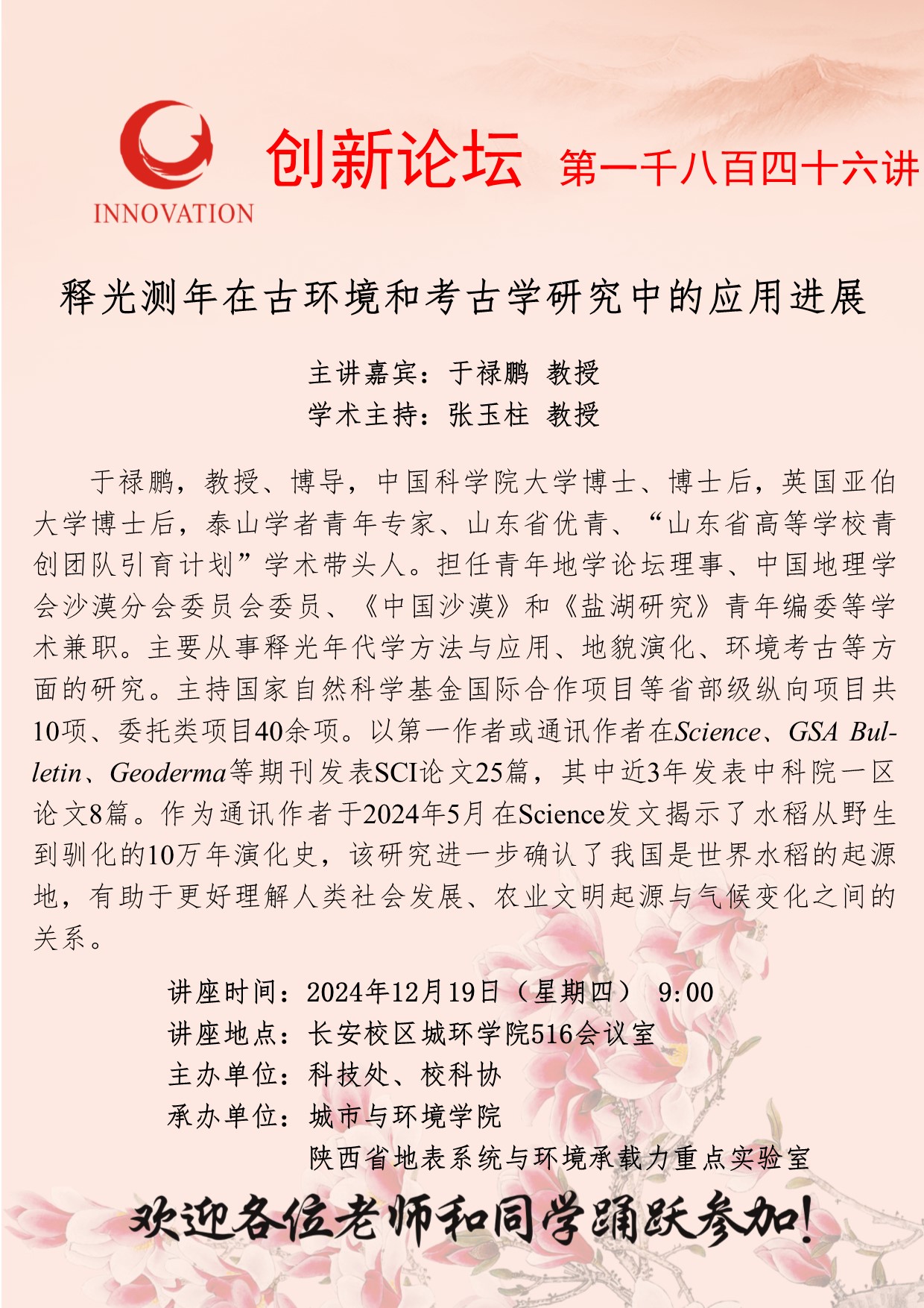 于禄鹏 教授 必赢3003no1线路检测中心创新论坛第一千八百四十六讲:释光测年在古环境和考古学研究中的应用进展 讲座时间 2024年12月19日(星期四) 9:00 讲座地点 长安校区城环学院516会议室 讲座人介绍 于禄鹏 教授 讲座内容