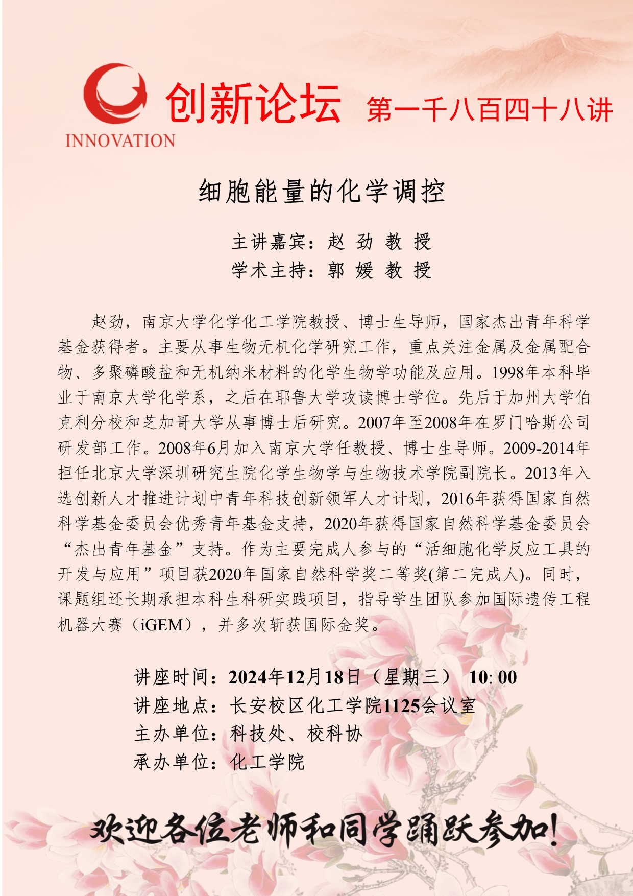 赵劲 教授 必赢3003no1线路检测中心创新论坛第一千八百四十八讲:细胞能量的化学调控 讲座时间 2024年12月18日(星期三)10: 00 讲座地点 长安校区化工学院1125会议室 讲座人介绍 赵劲 教授 讲座内容