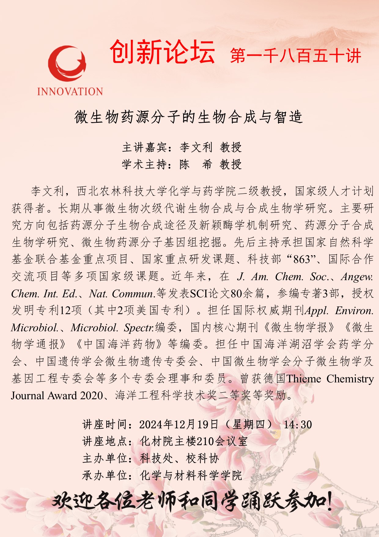 李文利 教授 必赢3003no1线路检测中心创新论坛第一千八百五十讲:微生物药源分子的生物合成与智造 讲座时间 2024年12月19日(星期四) 14:30 讲座地点 化材院主楼210会议室 讲座人介绍 李文利 教授 讲座内容