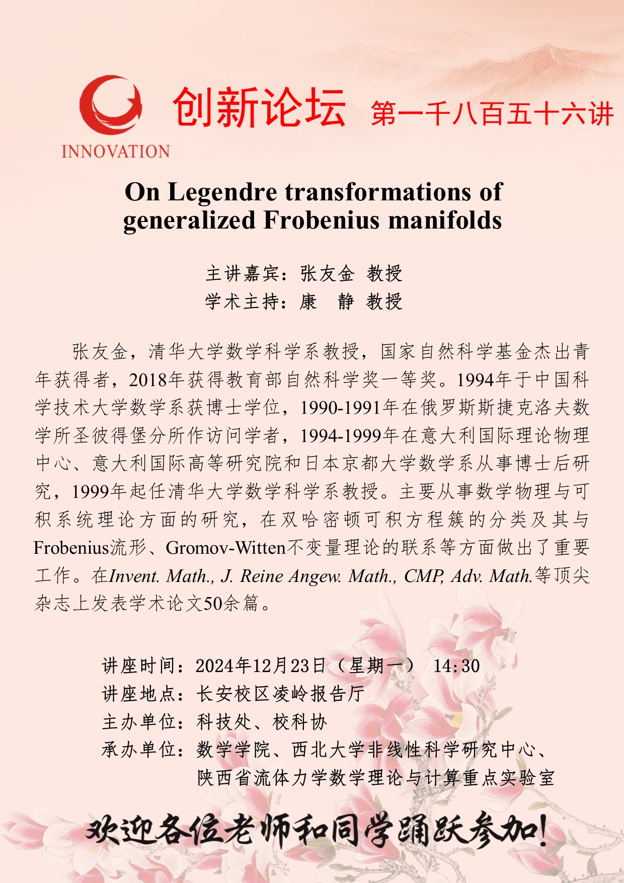 张友金 教授 必赢3003no1线路检测中心创新论坛第一千八百五十六讲:On Legendre transformations of generalized Frobenius manifolds 讲座时间 2024年12月23日(星期一) 14:30 讲座地点 长安校区凌岭报告厅 讲座人介绍 张友金 教授 讲座内容