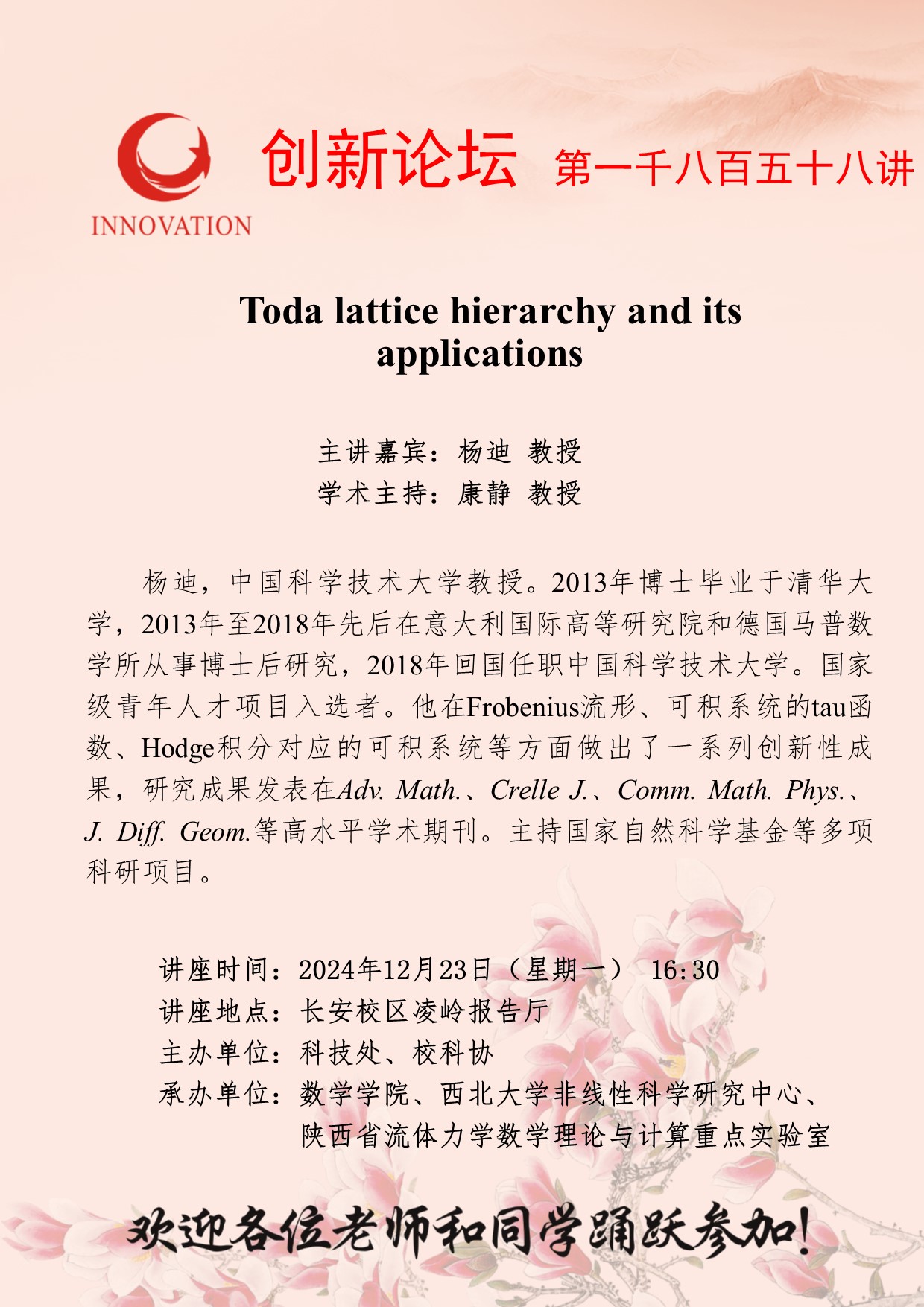 杨迪 教授 必赢3003no1线路检测中心创新论坛第一千八百五十八讲:Toda lattice hierarchy and its applications 讲座时间 2024年12月23日(星期一) 16:30 讲座地点 长安校区凌岭报告厅 讲座人介绍 杨迪 教授 讲座内容
