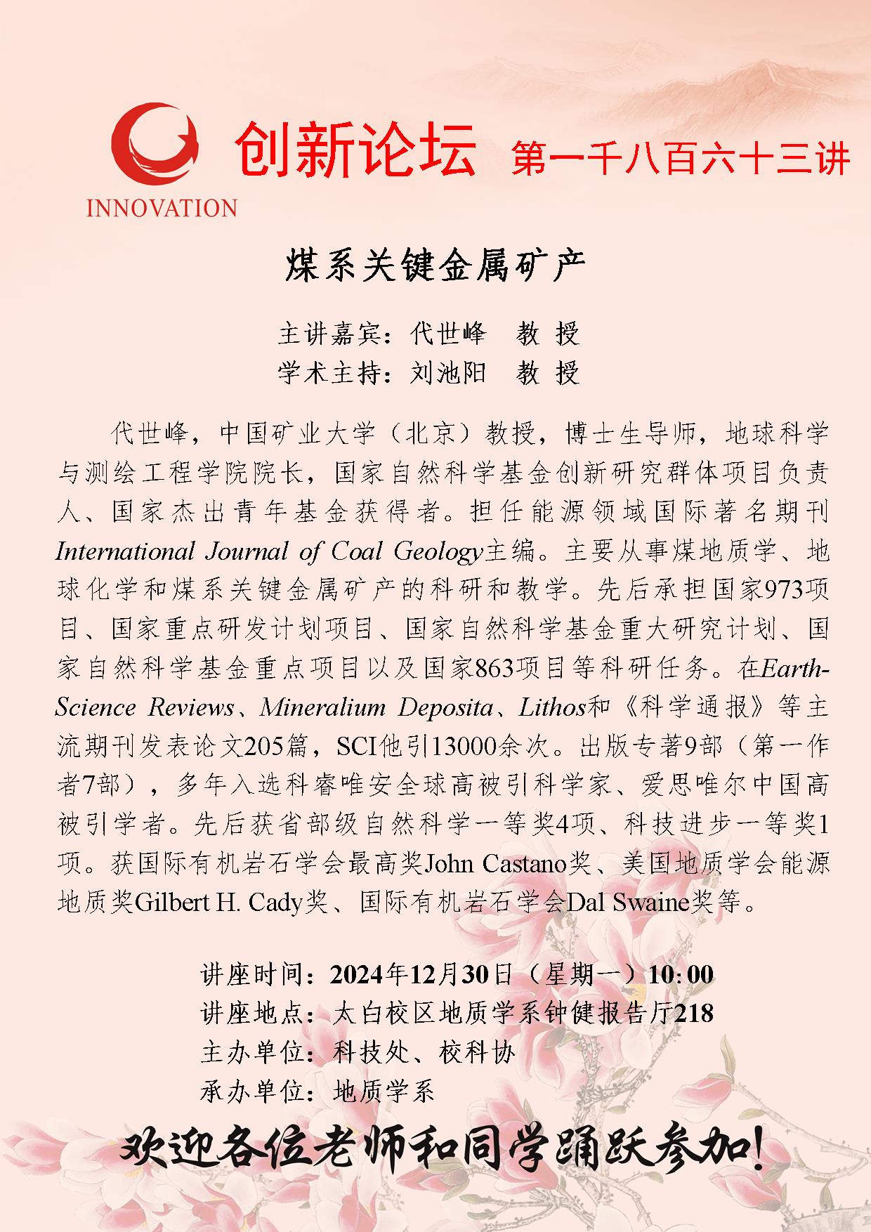 代世峰 教授 必赢3003no1线路检测中心创新论坛第一千八百六十三讲:煤系关键金属矿产 讲座时间 2024年12月30日(星期一)10:00 讲座地点 太白校区地质学系钟健报告厅218 讲座人介绍 代世峰 教授 讲座内容