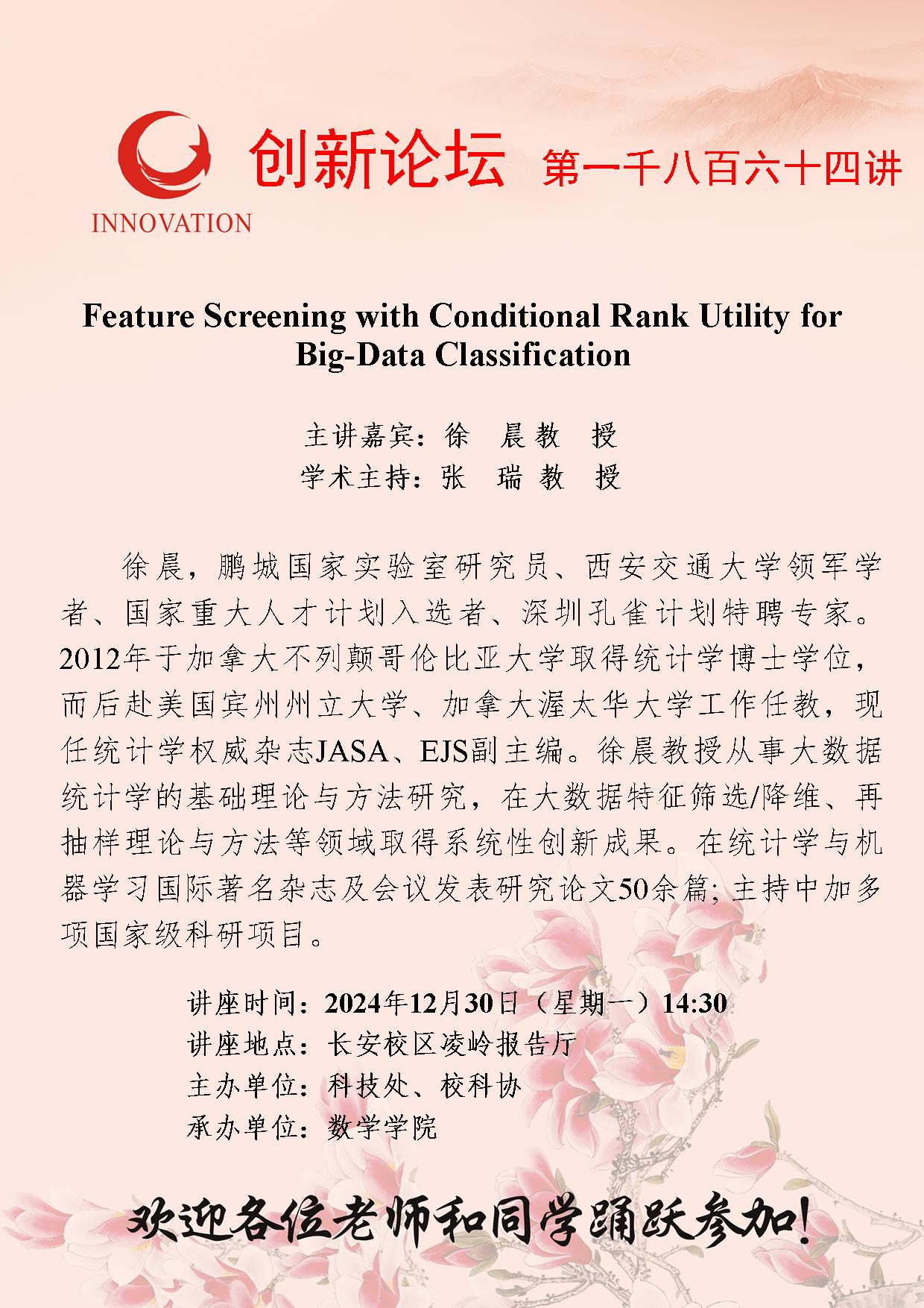 徐晨 教授 必赢3003no1线路检测中心创新论坛第一千八百六十四讲:Feature Screening with Conditional Rank Utility for Big-Data Classification 讲座时间 2024年12月30日(星期一)14:30 讲座地点 长安校区凌岭报告厅 讲座人介绍 徐晨 教授 讲座内容