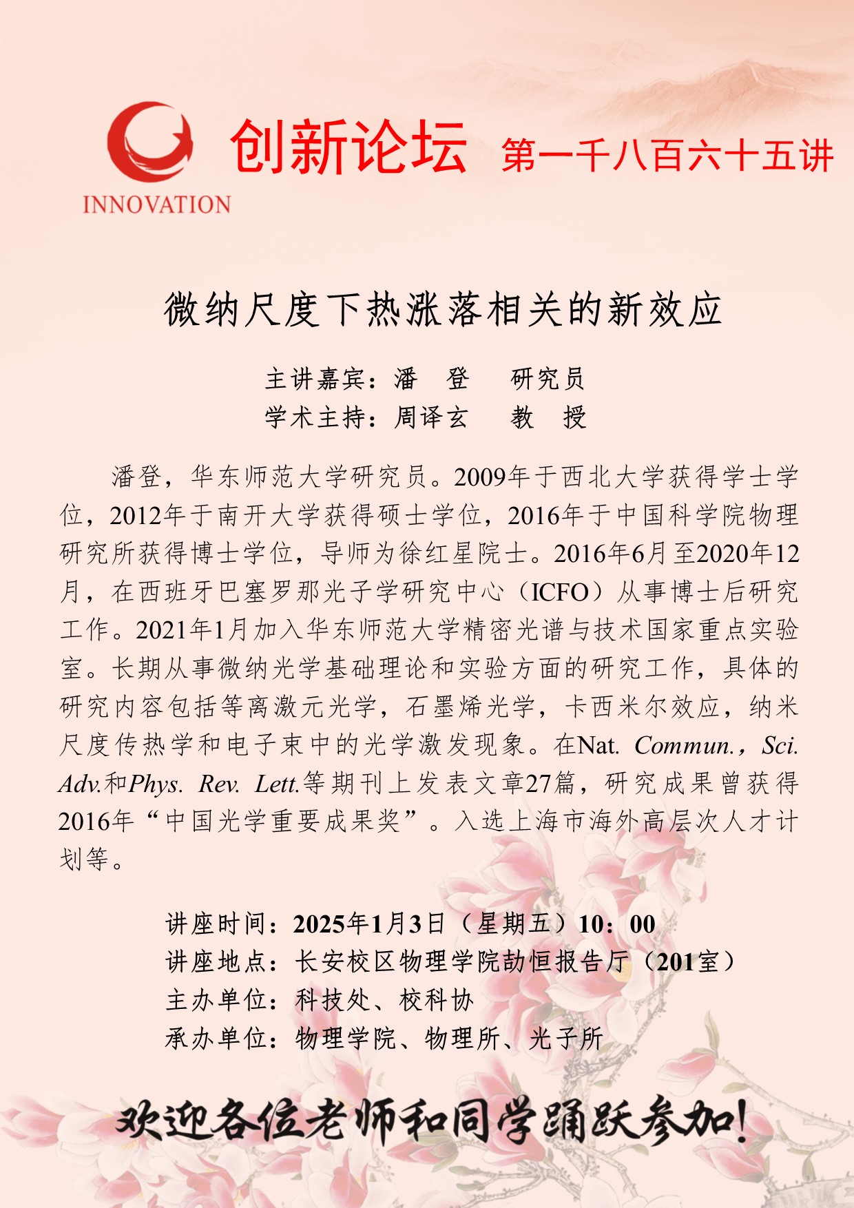 潘登 研究员 必赢3003no1线路检测中心创新论坛第一千八百六十五讲:微纳尺度下热涨落相关的新效应 讲座时间 2025年1月3日(星期五)10:00 讲座地点 长安校区物理学院劼恒报告厅(201室) 讲座人介绍 潘登 研究员 讲座内容