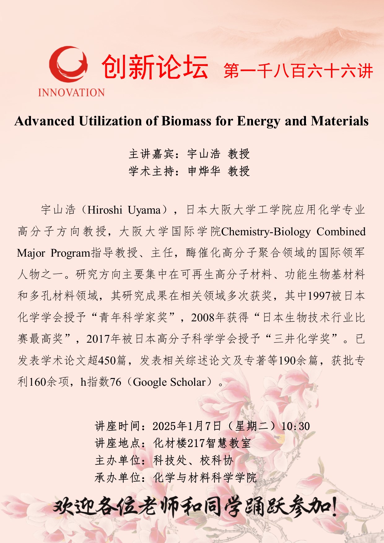 宇山浩 教授 必赢3003no1线路检测中心创新论坛第一千八百六十六讲:Advanced Utilization of Biomass for Energy and Materials 讲座时间 2025年1月7日(星期二)10:30 讲座地点 化材楼217智慧教室 讲座人介绍 宇山浩 教授 讲座内容