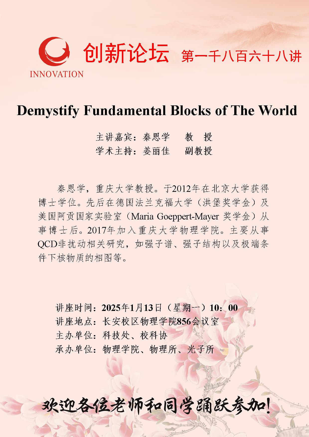 秦思学 教授 必赢3003no1线路检测中心创新论坛第一千八百六十八讲:Demystify Fundamental Blocks of The World 讲座时间 2025年1月13日(星期一)10:00 讲座地点 长安校区物理学院856会议室 讲座人介绍 秦思学 教授 讲座内容