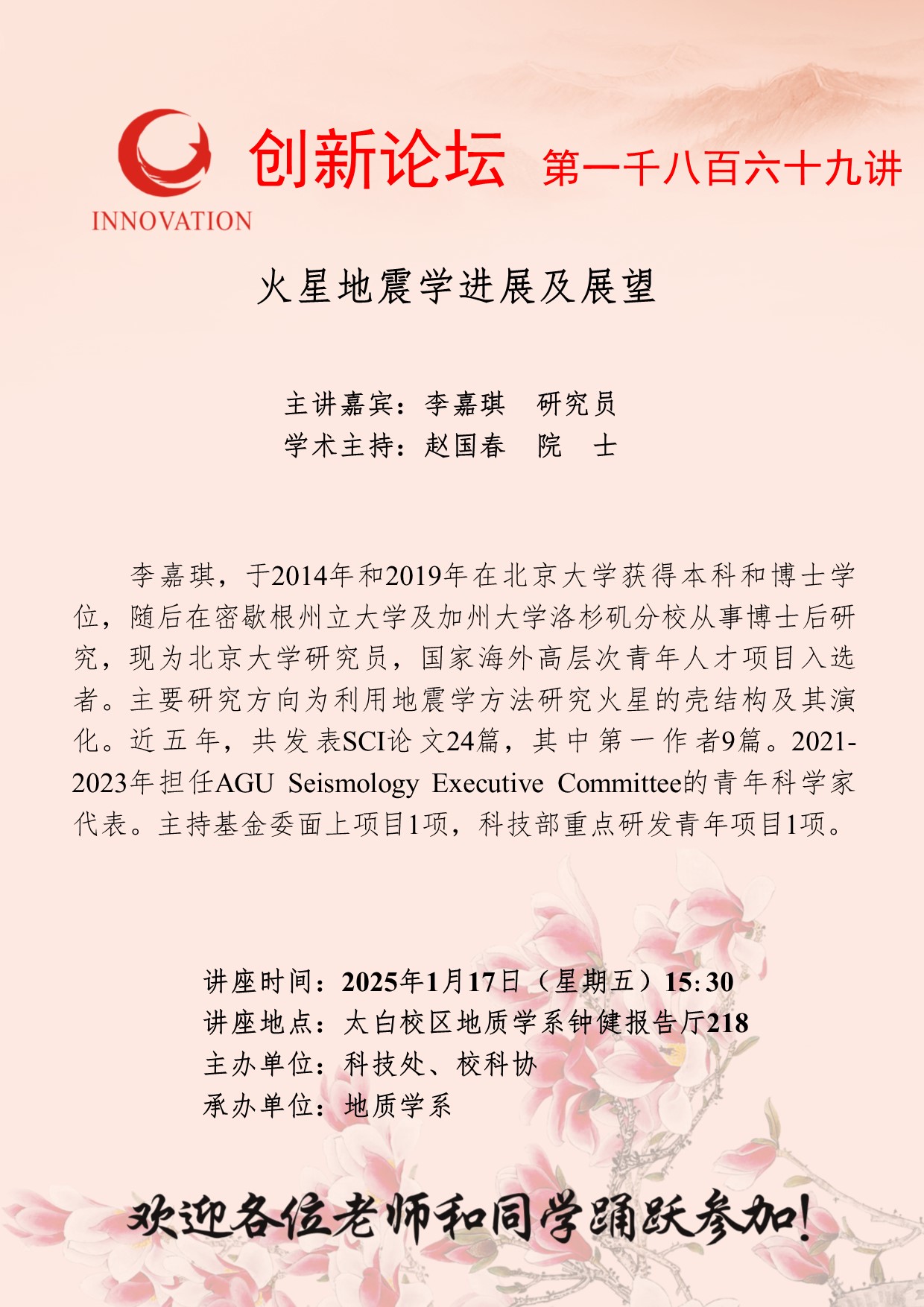 李嘉琪 研究员 必赢3003no1线路检测中心创新论坛第一千八百六十九讲:火星地震学进展及展望 讲座时间 2025年1月17日(星期五)15:30 讲座地点 太白校区地质学系钟健报告厅218 讲座人介绍 李嘉琪 研究员 讲座内容