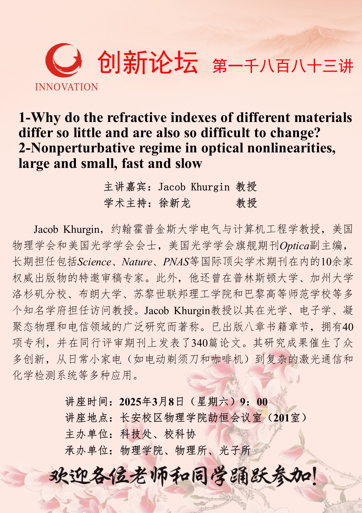 Jacob Khurgin 教授 必赢3003no1线路检测中心创新论坛第一千八百八十三讲:1-Why do the refractive indexes of different materials differ so little and are also so difficult to change? 讲座时间 2025年3月8日(星期六)9:00 讲座地点 长安校区物理学院劼恒会议室(201室) 讲座人介绍 Jacob Khurgin 教授 讲座内容