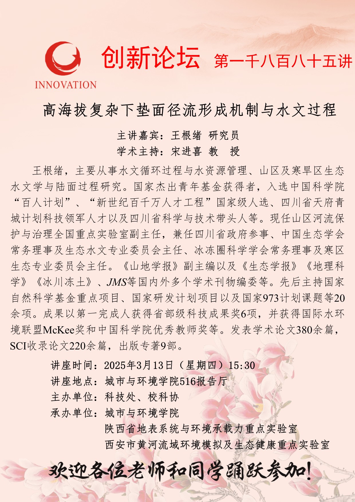 王根绪 研究员 必赢3003no1线路检测中心创新论坛第一千八百八十五讲:高海拔复杂下垫面径流形成机制与水文过程模拟 讲座时间 2025年3月13日(星期四)15:30 讲座地点 城市与环境学院516报告厅 讲座人介绍 王根绪 研究员 讲座内容