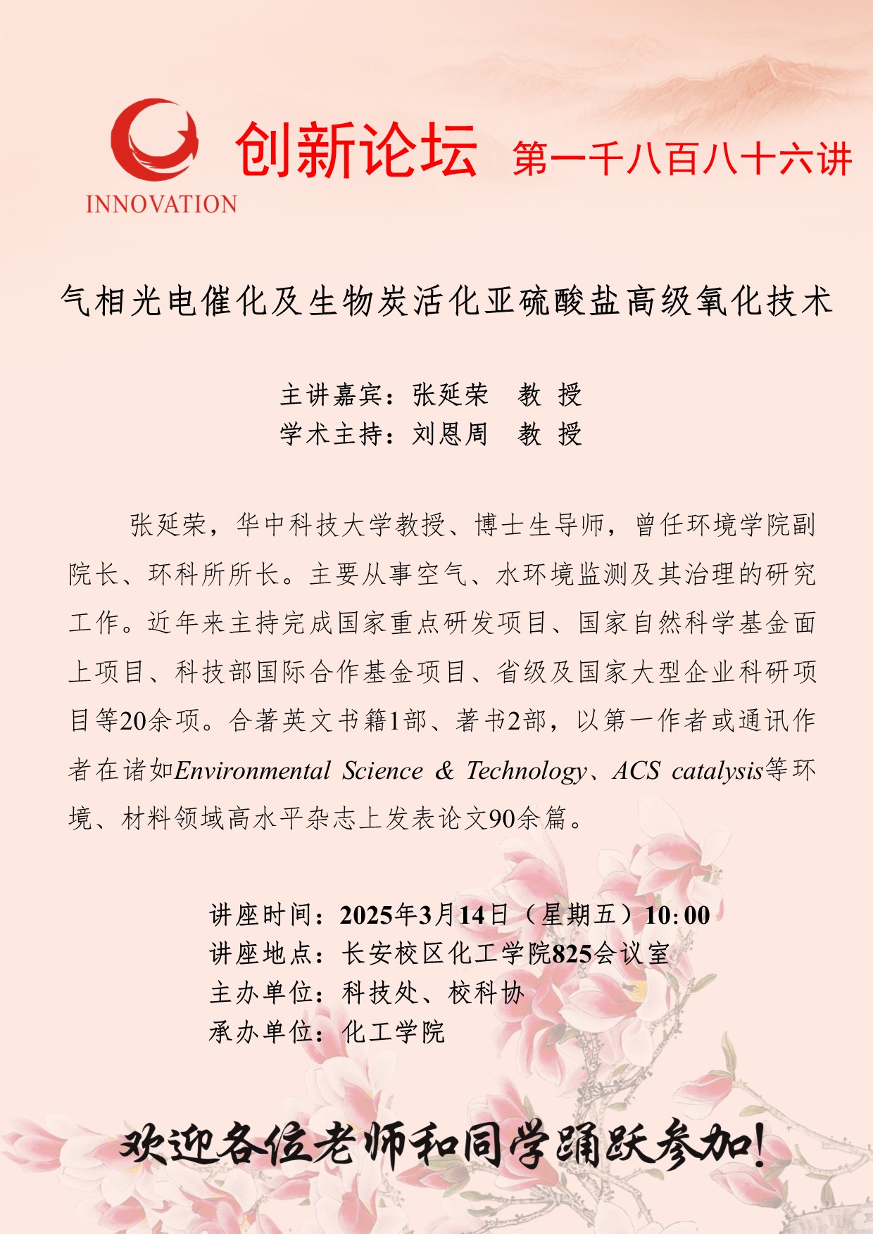 张延荣 教授 必赢3003no1线路检测中心创新论坛第一千八百八十六讲:气相光电催化及生物炭活化亚硫酸盐高级氧化技术 讲座时间 2025年3月14日(星期五)10:00 讲座地点 长安校区化工学院825会议室 讲座人介绍 张延荣 教授 讲座内容