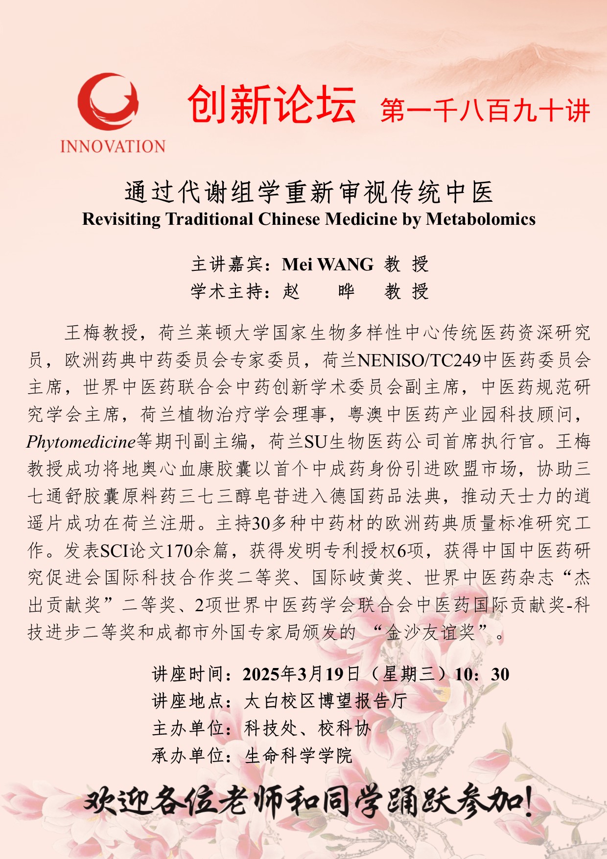 Mei WANG 教授 必赢3003no1线路检测中心创新论坛第一千八百九十讲:通过代谢组学重新审视传统中医Revisiting Traditional Chinese Medicine by Metabolomics 讲座时间 2025年3月19日(星期三)10:30 讲座地点 太白校区博望报告厅 讲座人介绍 Mei WANG 教授 讲座内容