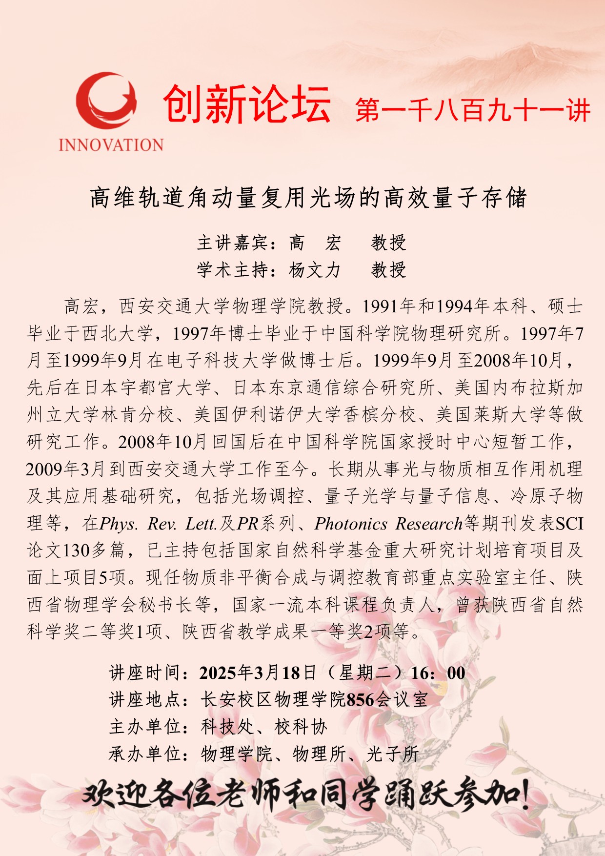 高宏 教授 必赢3003no1线路检测中心创新论坛第一千八百九十一讲:高维轨道角动量复用光场的高效量子存储 讲座时间 2025年3月18日(星期二)16:00 讲座地点 长安校区物理学院856会议室 讲座人介绍 高宏 教授 讲座内容