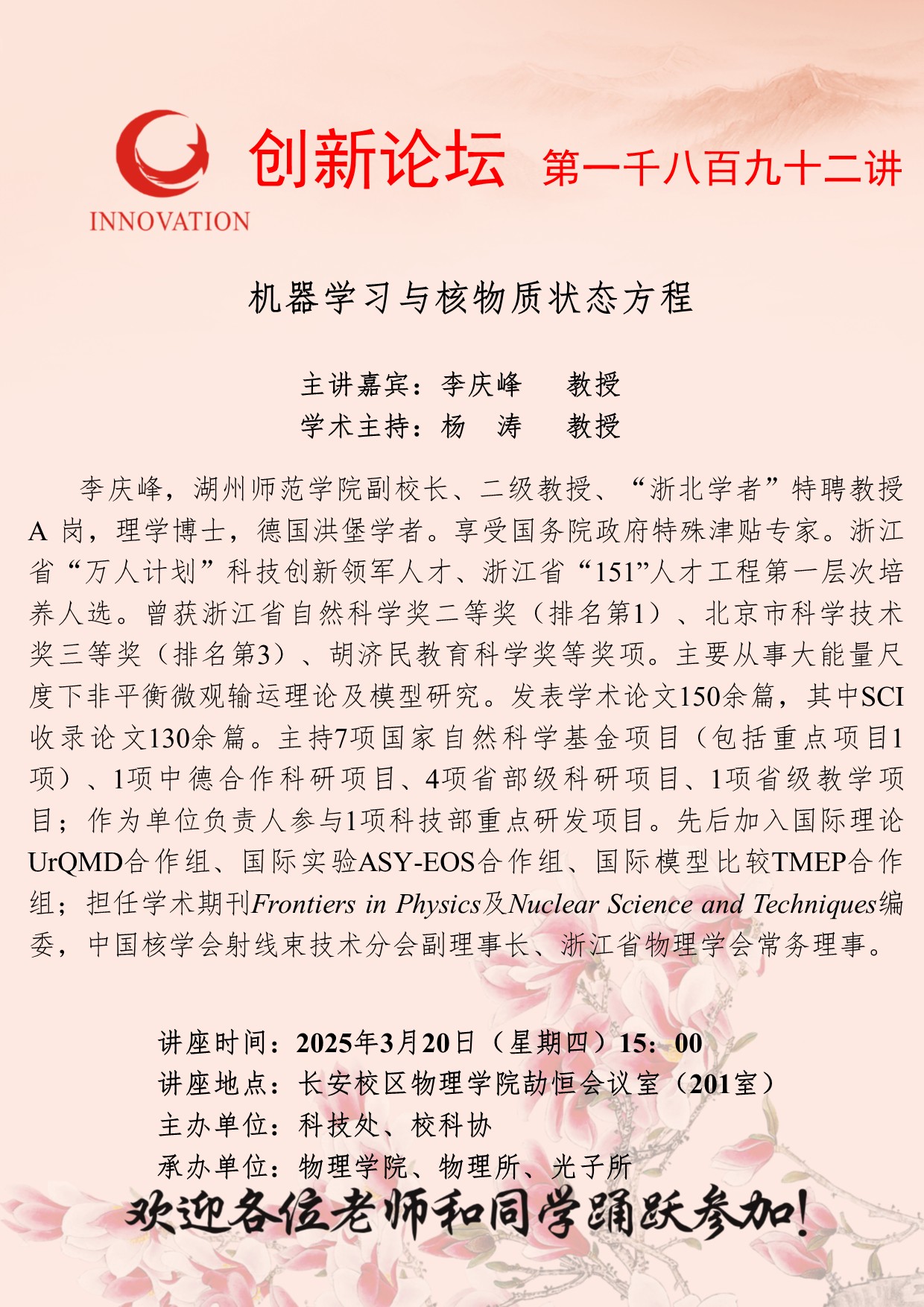 李庆峰 教授 必赢3003no1线路检测中心创新论坛第一千八百九十二讲:机器学习与核物质状态方程 讲座时间 2025年3月20日(星期四)15:00 讲座地点 长安校区物理学院劼恒会议室(201室) 讲座人介绍 李庆峰 教授 讲座内容