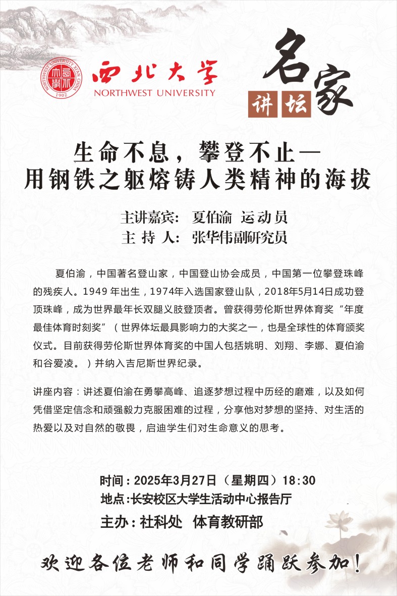夏伯渝 运动员 名家讲坛:生命不息,攀登不止-用钢铁之躯熔铸人类精神的海拔 讲座时间 2025年3月27日(星期四)18:30 讲座地点 长安校区大学生活动中心报告厅 讲座人介绍 夏伯渝 运动员 讲座内容
