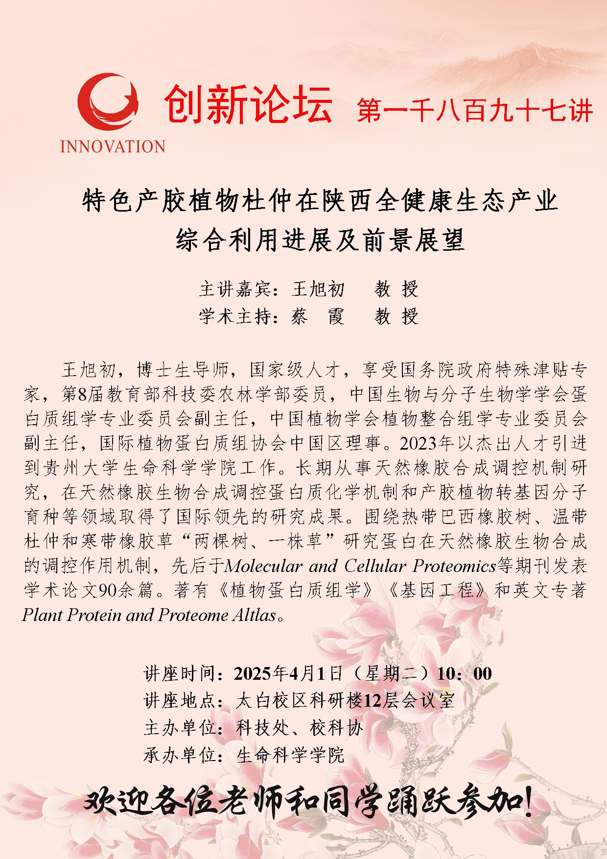 王旭初 教授 必赢3003no1线路检测中心创新论坛第一千八百九十七讲:特色产胶植物杜仲在陕西全健康生态产业综合利用进展及前景展望 讲座时间 2025年4月1日(星期二)10:00 讲座地点 太白校区科研楼12层会议室 讲座人介绍 王旭初 教授 讲座内容