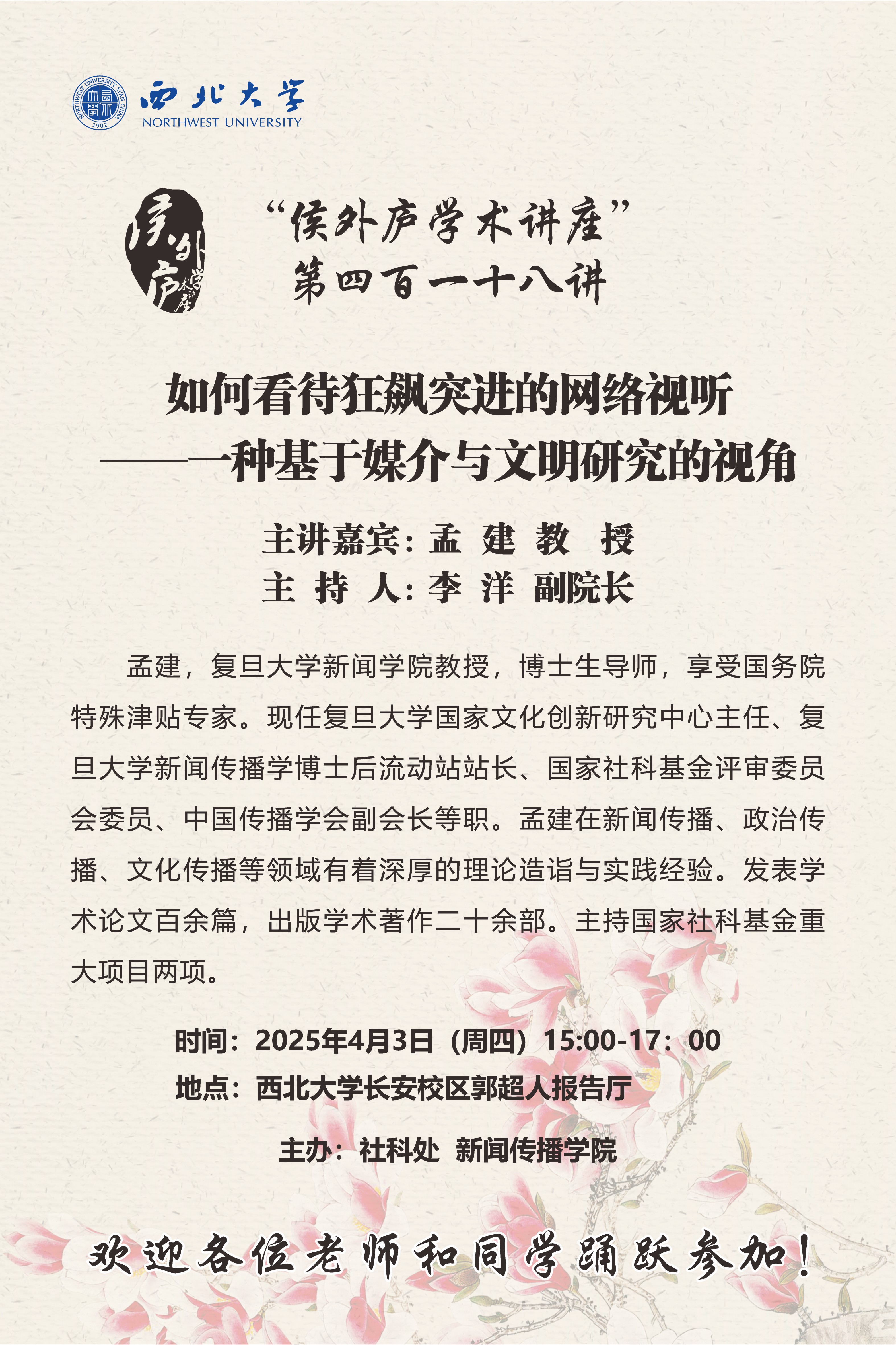 孟建 教授 “侯外庐学术讲座”第四百一十八讲:如何看待狂飙突进的网络视听——一种基于媒介与文明研究的视角 讲座时间 2025年4月3日(周四)15:00-17:00 讲座地点 必赢3003no1线路检测中心长安校区郭超人报告厅 讲座人介绍 孟建 教授 讲座内容